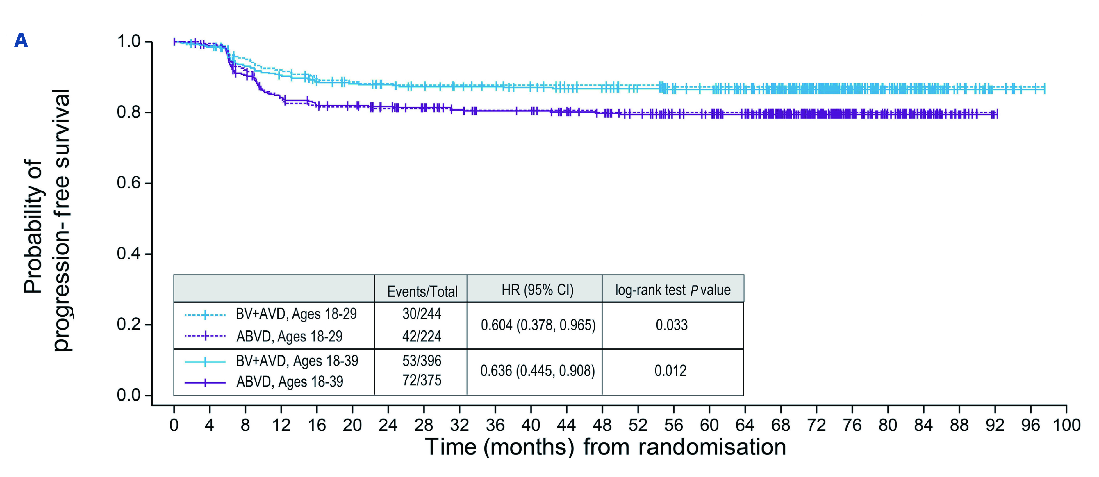 The ECHELON-1 study, an open-label, multicentred, randomised phase 3 trial included 1,334 patients in which 664 and 670 patients were randomly assigned to BV+AVD and ABVD groups, respectively14. The primary endpoint of ECHELON-1 study was modified progression free survival (PFS), defined as time to disease progression, death, or modified progression (with the latter defined as evidence of noncomplete response after completion of frontline therapy according to review by an independent committee, followed by subsequent anticancer therapy) and the key secondary end point was overall survival, defined as the time from randomisation14. At a median follow-up of 24.6 months, the 2-year modified PFS in BV+ AVD and ABVD groups were 82.1% (95% confidence interval [CI]: 78.8-85.0) and 77.2% (95% CI: 73.7-80.4), respectively, a difference of 4.9 percentage points (hazard ratio for event of progression, death, or modified progression, 0.77; 95% CI: 0.60-0.98; p=0.04)14. Given the prevalence of the adolescents and young adults (AYA) population in advanced cHL and its significant proportion in the ECHELON-1 trial (accounting for 58% of the intend-to-treat [ITT] population), a subgroup analysis of ECHELON-1 was started in the AYA patients aged from 18 to 39 to evaluate the consistency of the safety and efficacy of BV+AVD regimen at 6 years15. Among them, 396 patients received the BV+AVD regimen and 375 received ABVD regimen15 .