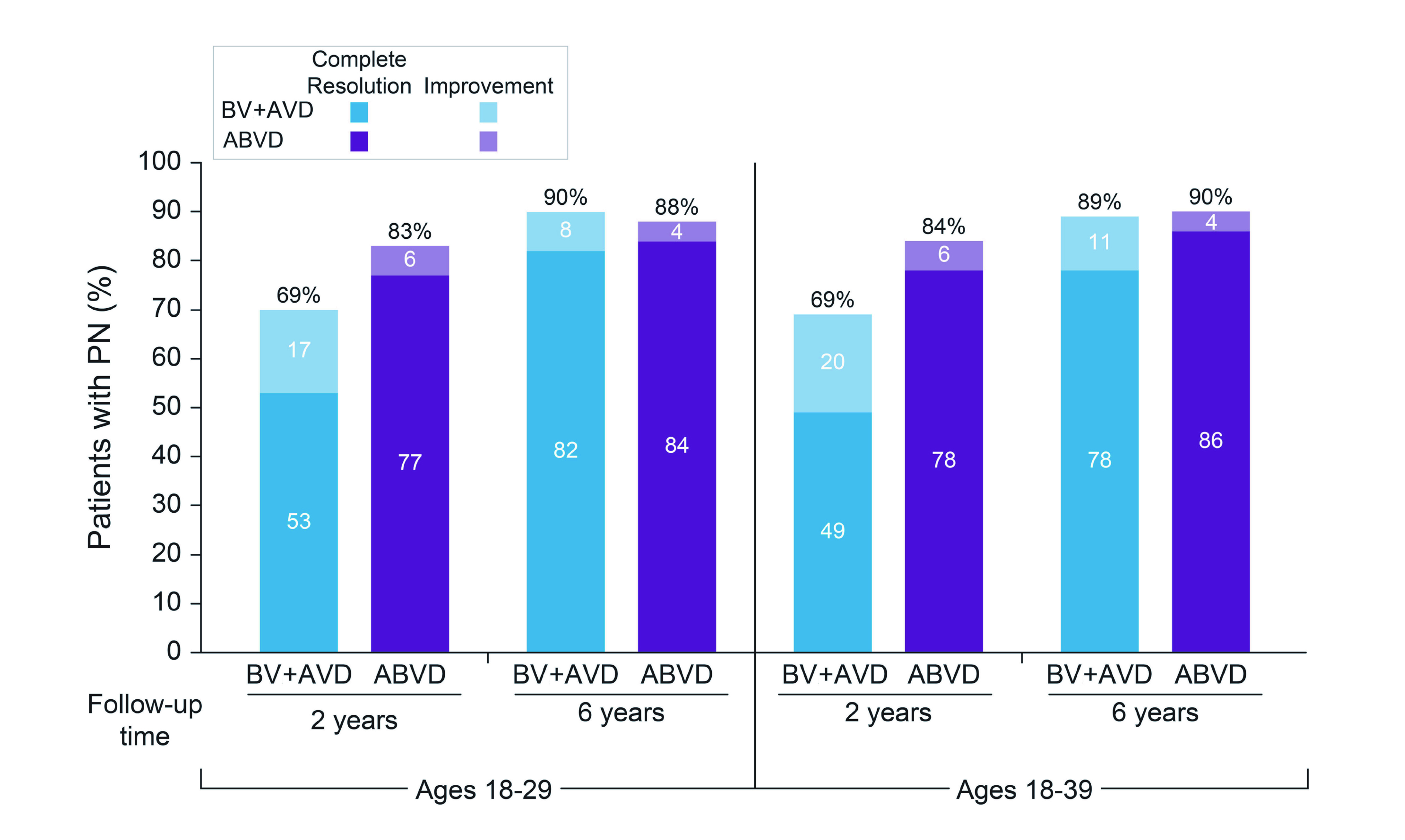 Since the long-term sequelae of HL treatment have been a concern in long-term survivorship11,16, adverse events have been analysed in this study. Notably, no impact on fertility was seen in females on BV+AVD regimen, in that BV+AVD arm has a higher pregnancy rate of 23.4% compared to 16.8% in the ABVD arm. Nor did males suffer from infertility, as 31 and 30 partners of the male HL patients were able to become pregnant in BV+AVD and ABVD groups, respectively. As for secondary malignancies, less than 2% of second cancers were found in each arm, which was even lower than the ITT population in ECHELON-1 trial (3.5% with BV+AVD and 4.9% with ABVD)15,17, thus establishing the long-term safety of BV+AVD regimen. Finally, a higher risk of developing peripheral neuropathy (PN) was identified, with 64% in the BV+AVD arm and 40% in the ABVD arm reported to have any-grade PN. Fortunately, 78% of patients attained a complete resolution and 11% had an improvement at 6 years (Figure 2), which means proactive management makes PN a manageable side effect15.