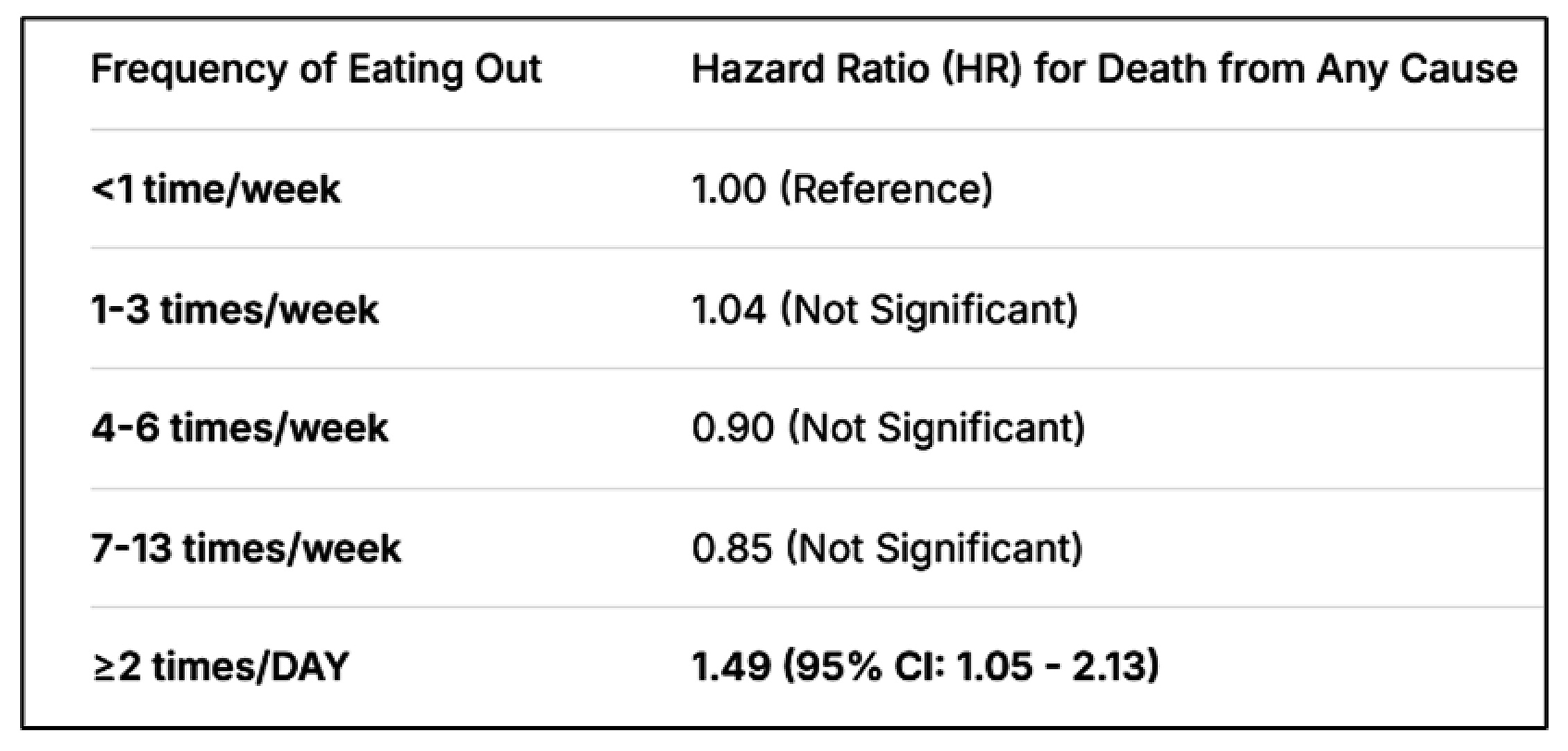 The relationship between frequent consumption of meals prepared away from home and health outcomes has been systematically examined in major studies. A key investigation analysed data from over 35,000 American adults followed for nearly two decades. The study accounted for variables including age, sex, socioeconomic status, dietary quality, lifestyle factors, and body mass index. The results revealed that participants who consumed two or more meals prepared away from home per day had 49% higher risk of death from any cause compared to those who ate such meals less than once per week (Figure. 1).