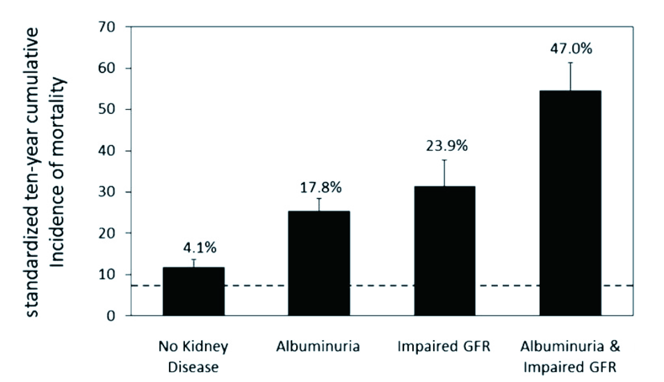 Figure 1: 10-year mortality in DM by kidney disease manifestation7