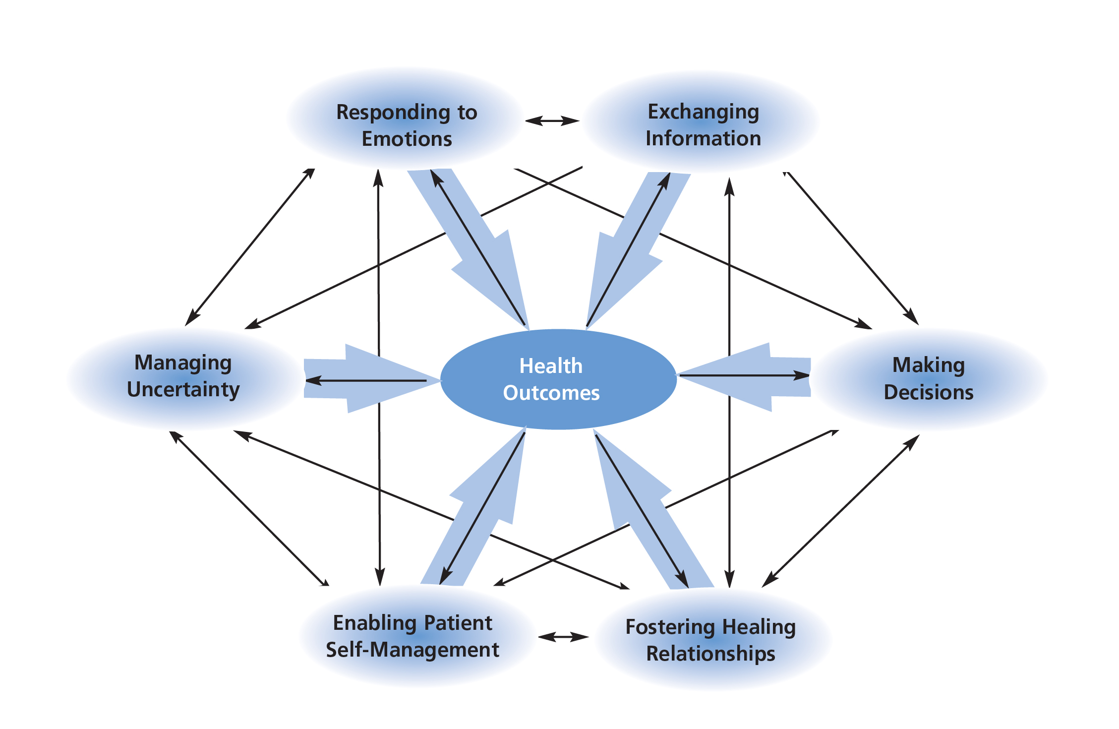 • Exchanging information emphasizes the importance of recognizing patients’ information needs, integrating clinical information with the patient’s illness representations, acknowledging both the content and process of information exchange, recognizing that disease-related information now is more available through the Internet, communicating prognostic information accurately while also providing hope, and overcoming barriers related to low health literacy and poor understanding of statistical information.