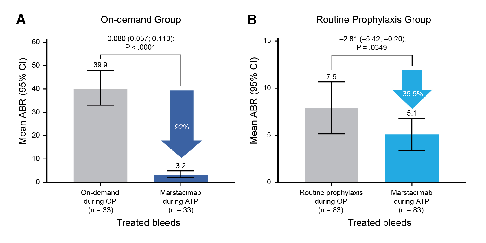 In BASIS, a phase III, open-label, crossover trial, marstacimab was studied as a prophylactic treatment for severe hemophilia A and moderately severe to severe hemophilia B. In one cohort of the study, 116 patients without inhibitor antibodies were treated with weekly subcutaneous marstacimab in the active treatment phase of the study.19 In the patients who had previously received on-demand clotting factors, the mean annualized bleeding rate (ABR) decreased from 39.9% to 3.2% with marstacimab treatment, corresponding to a reduction of 92%. In the group that had previously been receiving routine prophylaxis with replacement factors, the ABR decreased from 7.9% to 5.1%, corresponding to a decrease of 35.5% (Figure 1).19 The BASIS trial also included patients with inhibitors to coagulation factors. These data have not been fully reported, but in June positive findings in this setting were also announced.18