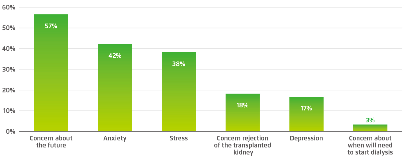The survey took a closer look at the nature of adverse quality of life in patients with kidney diseases. For instance, the results indicated that fatigue (61%), sleep problems (47%) and shortness of breath (47%) are the most common physical conditions affected quality of life reported by the patients (Figure 3). In the psychological aspect, concern about future (57%), anxiety (42%) and mental stress (38%) were the major factors contributed to the adverse quality of life among the respondents (Figure 4). In addition, the results visualised the potential socioeconomic impacts concerned by the patients, with the potential impact on financial status be the most common problem reported (50%). Concerns for diet restriction (39%), impacts on family and friends (38%), and working ability (38%) were major factors adversely affected the living of the patients as well5.