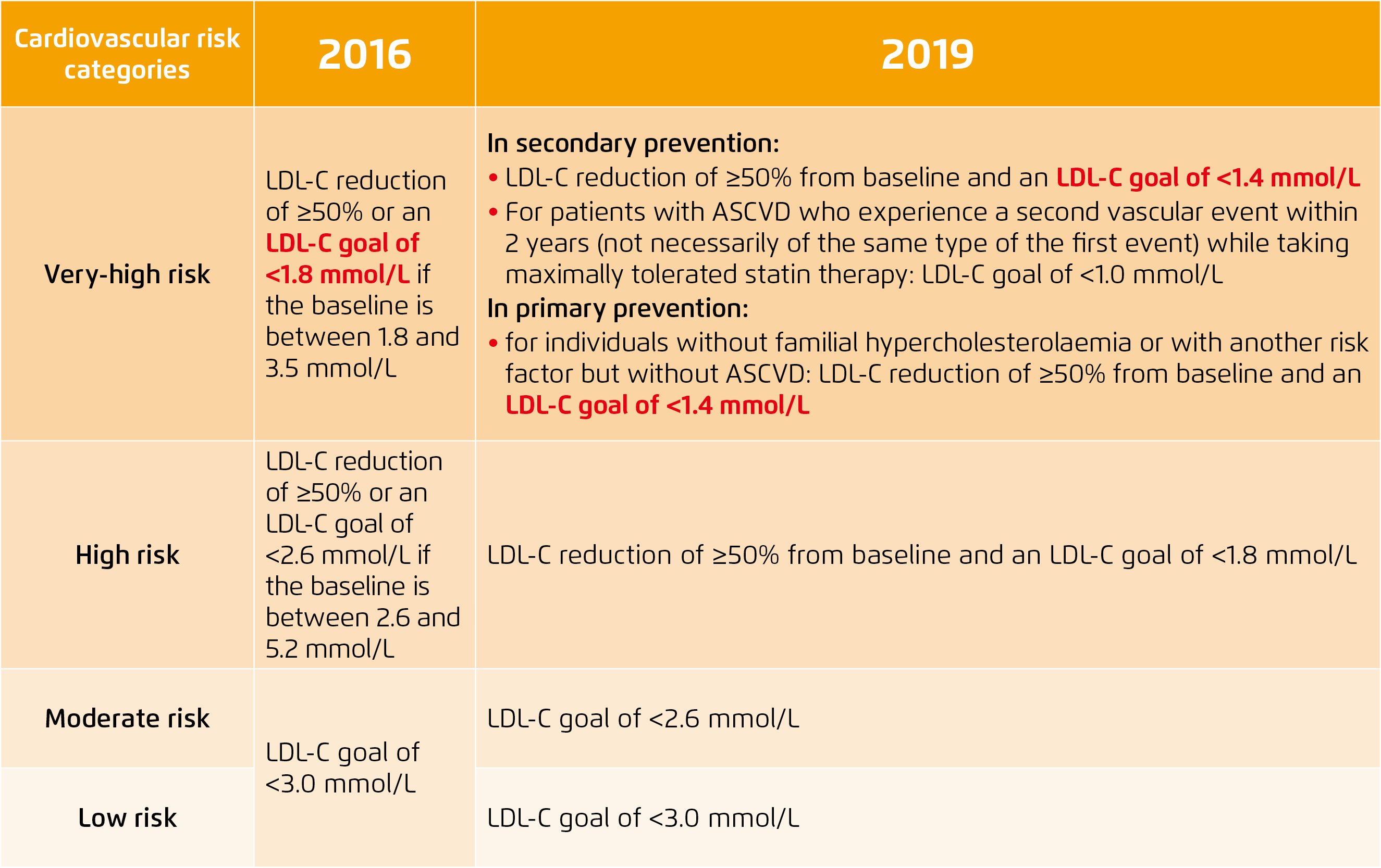 “The 2019 ESC/EAS Guidelines for the Management of Dyslipidaemias” recommends more intensive reduction of LDL-C across cardiovascular risk categories, listing a revised concept of LDL-C goal of <1.4 mmol/L and <1.8 mmol/L for very-high risk patients and high risk patients respectively.