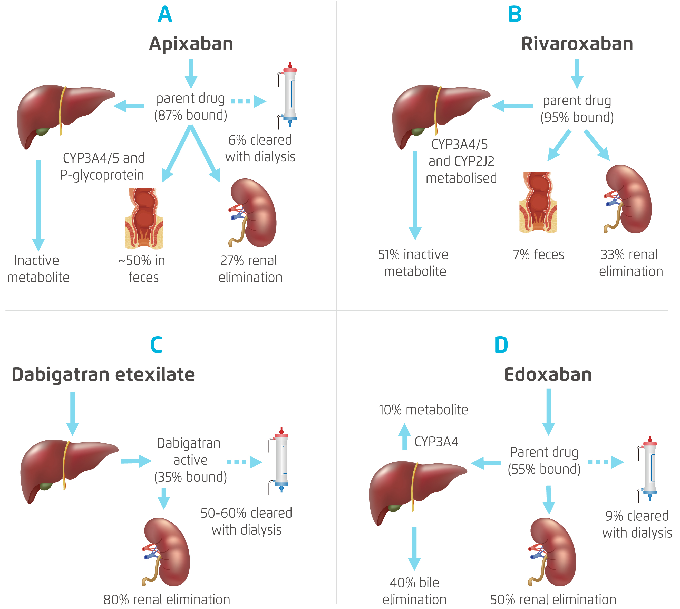 1. Tapoi et al. J. Nephrol. 2019; 32: 909-17. 2. Herzog et al. Kidney Int 2011; 80: 572-86. 3. Reinecke et al. J Am Soc Nephrol 2009; 20: 705-11. 4. Connolly et al. N Engl J Med 2009; 361: 1139-51. 5. Granger et al. N Engl J Med 2011; 365: 981-92. 6. Giugliano et al. N Engl J Med 2013; 369: 2093-104. 7. Patel et al. N Engl J Med 2011; 365: 883-91. 8. Chan et al. J Am Coll Cardiol 2016; 67: 2888-99. 9. Soliman et al. Am Heart J 2010; 159: 1102-7. 10. Kiuchi. Kidney Res Clin Pract 2018; 37: 103-5. 11. Rizk et al. Kidney Int 2011; 80: 131-3. 12. Ishii et al. CEN case reports 2018; 7: 198-203. 13. Yu et al. JAMA Dermatology 2017; 153: 309-14. 14. Hughes et al. Clin Kidney J 2014; 7: 442-449. 15. Hijazi et al. Circulation 2014; 129: 961-70. 16. Bohula et al. Circulation 2016; 134: 24-36. 17. Fox et al. Eur Heart J 2011; 32: 2387-94. 18. Hohnloser et al. Eur Heart J 2012; 33: 2821-30. 19. Xarelto Hong Kong 20 mg Prescribing Information (November 2017). . 20. Turpie et al. Ther Adv Cardiovasc Dis 2017; 11: 243-56. 21. Apixaban - Summary of Product Characteristics (SmPC) - (emc). 22. Rivaroxaban - Summary of Product Characteristics (SmPC) - (emc). 23. Edoxaban - Summary of Product Characteristics (SmPC) - (emc). 24. Dabigatran - Summary of Product Characteristics (SmPC) - (emc). 25. Miao et al. Eur J Haematol 2020; 104: 328-35. 26. FDA, CDER. Highlights of Prescribing Information - Apixaban. 27. FDA, CDER. Highlights of Prescribing Information - Rivaroxaban. 2018 28. Yao et al. J Am Coll Cardiol 2017; 70: 2621-32. 29. Steffel et al. Eur Heart J 2018; 39: 1330-93.