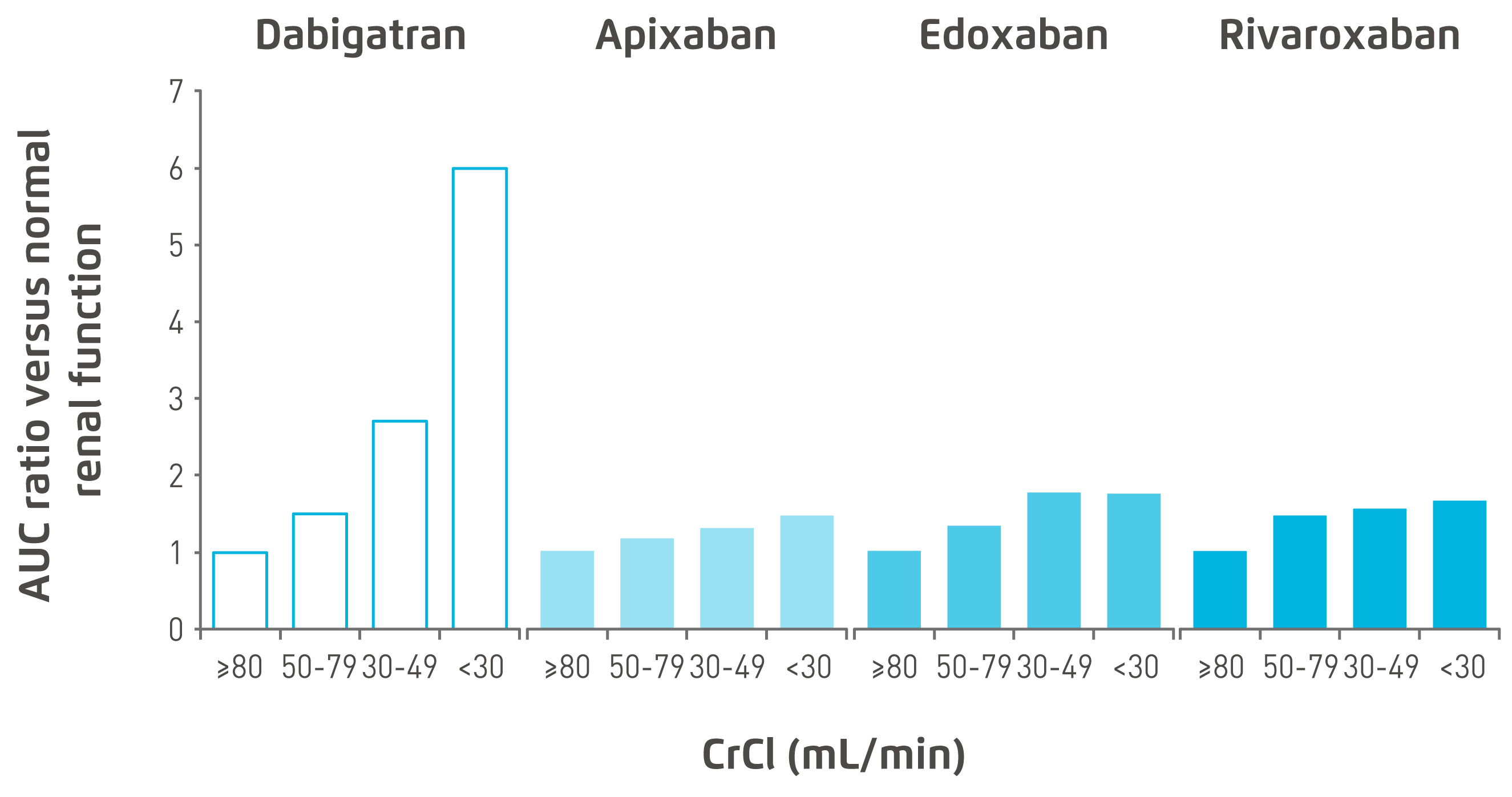 All NOACs depend on the kidneys for their elimination but to a different extent. The degree of clearance of apixaban (27%) and rivaroxaban (about 33%) by the kidneys was much lower than that of dabigatran (80%) and edoxaban (50%) (Figure 1)8,19 . Declining kidney function would reduce clearance of dabigatran and edoxaban much more than apixaban and rivaroxaban, thus leading to more accumulation of dabigatran and edoxaban and greater exposure to these NOACs in CKD subjects. Figure 2 depicts the pharmacokinetics profile of the various NOACs 20. Currently, apixaban, rivaroxaban and edoxaban, but not dabigatran, have extended approval for use in patients with severe CKD in Europe, i.e. a creatinine clearance (CrCl) rate of 15-29 mL/min, with the reduced dose regimen (Figure 3)21-24.