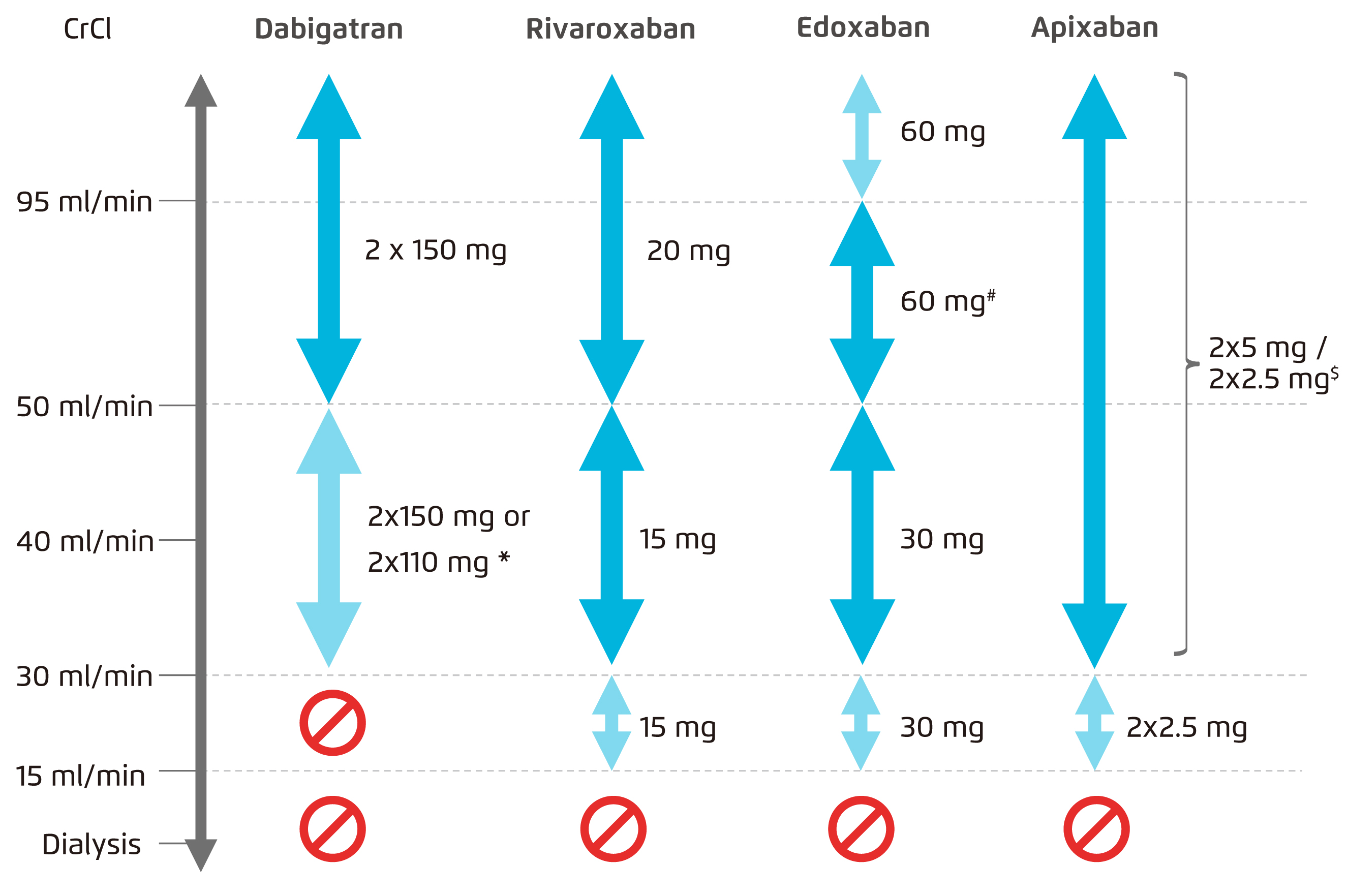 [(*2x110 mg in patients at high risk of bleeding (per SmPc). #Other dose reduction criteria may apply (weight ≤60 kg, concomitant potent P-Gp inhibitor therapy). $2x2.5 mg only if at least two out of three fulfilled: age ≥80 years, body weight ≤60 kg, creatinine ≥1.5 mg/dL (133 mmol/L). Orange arrows indicate cautionary use (dabigatran in moderate renal insufficiency, FXa inhibitors in severe renal insufficiency, edoxaban in 'supranormal’ renal function)]