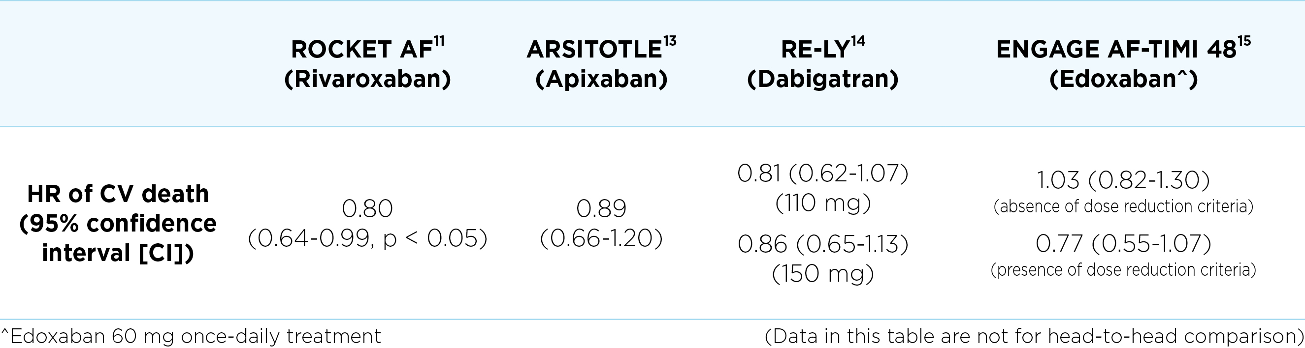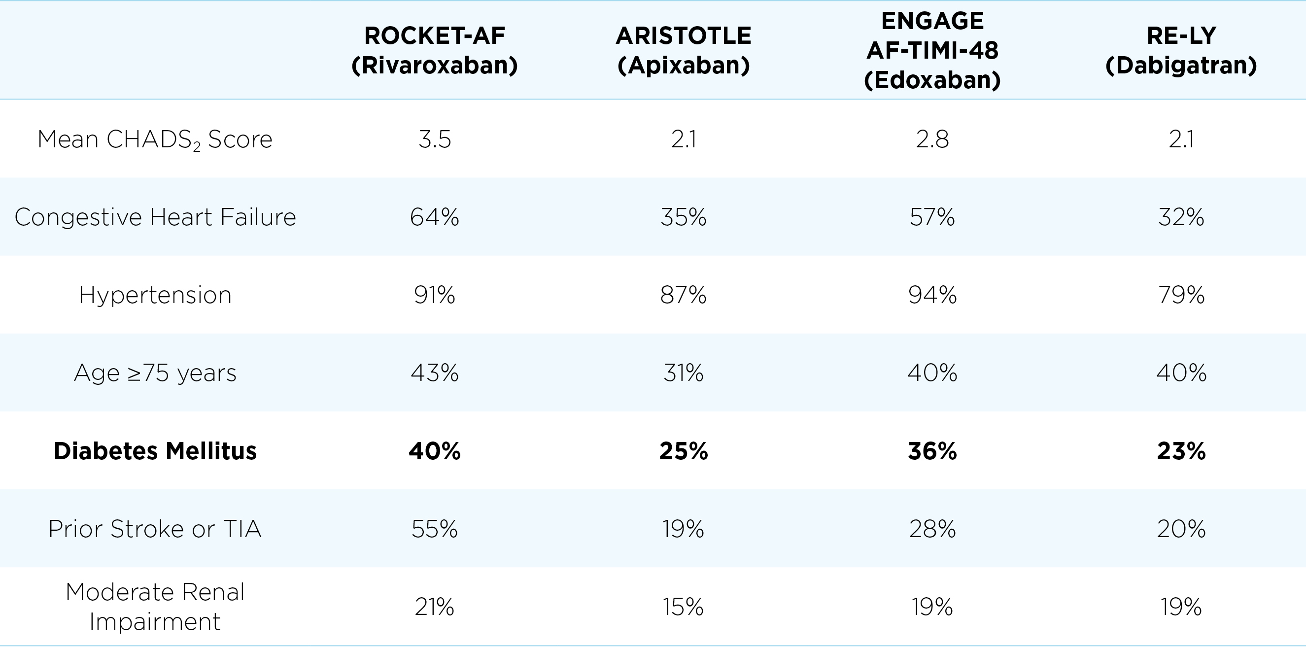 1. Oladiran et al. J Community Hosp Intern Med Perspect 2019; 9: 113-20. 2. Prídavková et al. J Diabetes Res 2019; : ID 5158308. 3. Ishii et al. CEN case reports 2018; 7: 198-203. 4. Petrie et al. Can. J. Cardiol. 2018; 34: 575-84. 5. Aune et al. J. Diabetes Complications. 2018; 32: 501-11. 6. Tadic et al. Arch. Cardiovasc. Dis. 2015; 108: 269-76. 7. Connolly et al. N Engl J Med 2009; 361: 1139-51. 8. Patel et al. N Engl J Med 2011; 365: 883-91. 9. Granger et al. N Engl J Med 2011; 365: 981-92. 10. Giugliano et al. N Engl J Med 2013; 369: 2093-104. 11. Bansilal et al. American Heart Journal. 2015: 675-682.e8. 12. Lip et al. Mayo Clin Proc 2020; 95: 929-43. 13. Ezekowitz et al. Eur Hear J - Cardiovasc Pharmacother 2015; 1: 86-94. 14. Brambatti et al. Int J Cardiol 2015; 196: 127-31. 15. Plitt et al. Int J Cardiol 2020; 304: 185-91. 16. Cerdá et al. J Comp Eff Res 2019; 8: 165-78.