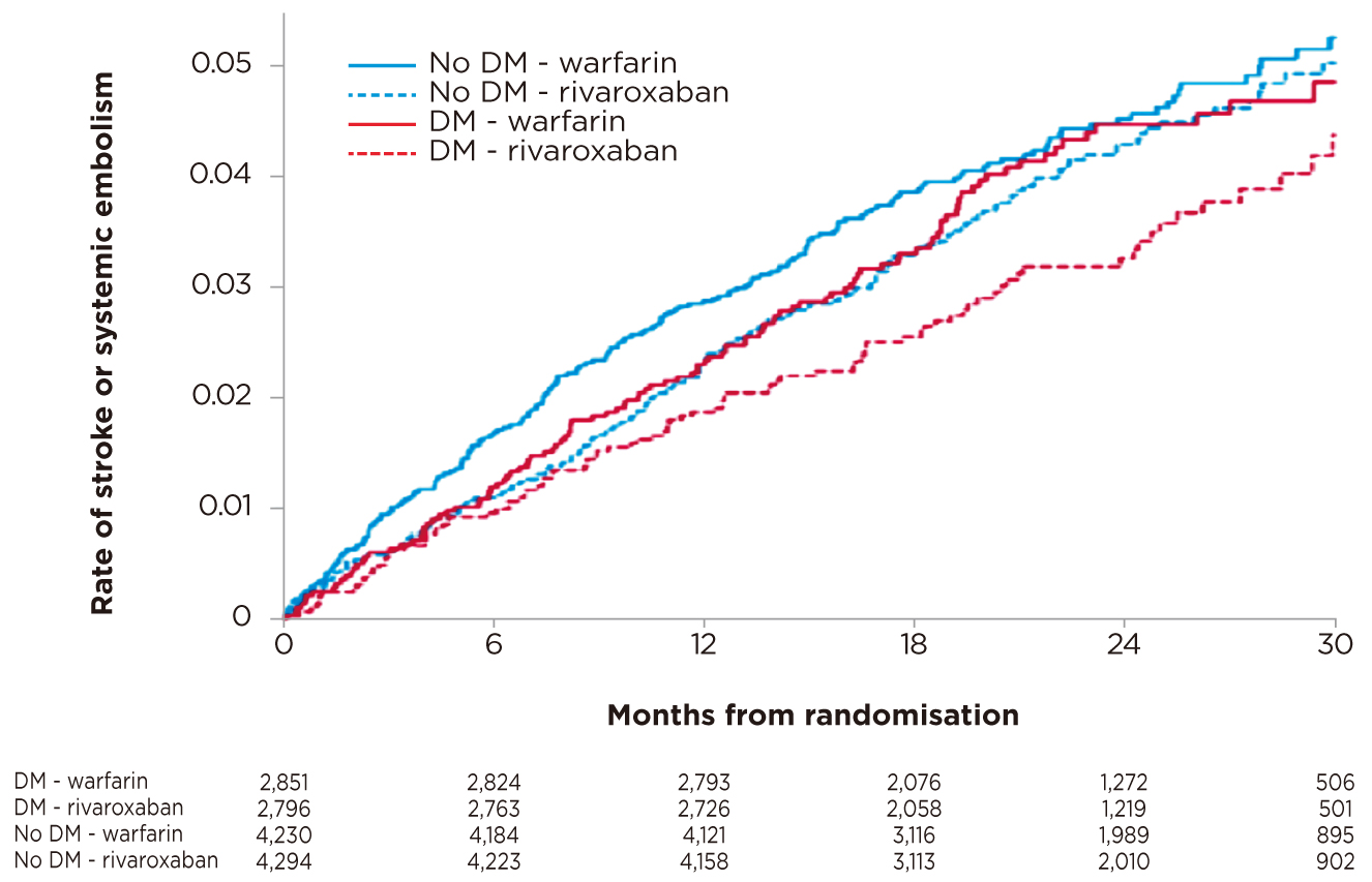 NOACs are commonly prescribed for AF patients to prevent stroke, whereas the efficacies of the 4 major NOACs, i.e. dabigatran, rivaroxaban, apixaban and edoxaban, have been proven in the 4 landmark randomised control trials (RCTs)7-10. Interestingly, in reviewing the baseline characteristics of the patients recruited, the proportion of patients with diabetes in the ROCKET-AF trial for rivaroxaban, about 40%8, was substantially higher as compared to those in the other 3 landmark trials, which ranged between 23%-36% (Table 1)7,9,10. Essentially, the benefits of rivaroxaban in preventing stroke were consistent in patients regardless of diabetes (Figure 1)11. These findings hence indicate the efficacies of rivaroxaban in diabetic AF patients.