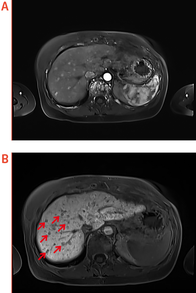 Figure 2. Liver metastasis identified by EOB-MRI, (a) axial arterial phase, (b) axial HBP