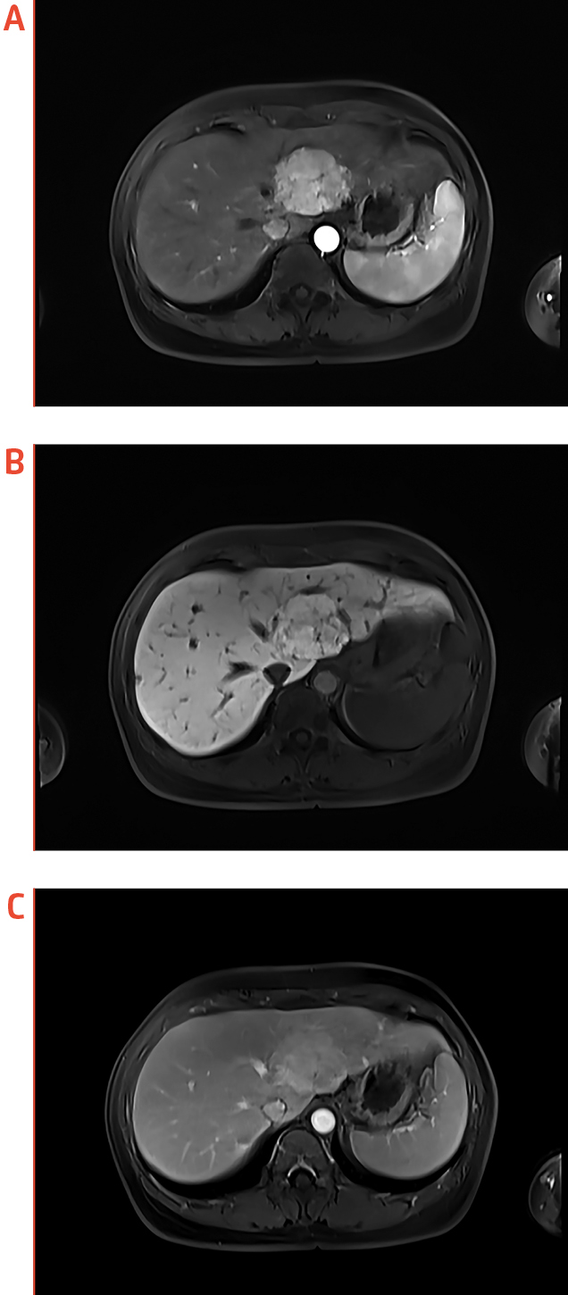 Figure 1. EOB-MRI identification of a FNH, (a) axial arterial phase, (b) axial HBP, and (c) axial portovenous phase