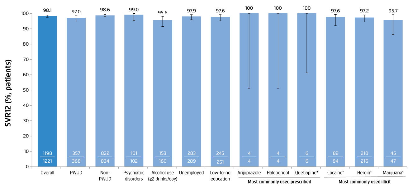 Newest data presented have further ascertained the efficacy and safety of DAA therapies. Glecaprevir/Pibrentasvir (G/P) therapy has been effective and well-tolerated in different populations, with sustained virologic response after 12 weeks of treatment (SVR12) of 97.7% (modified ITT [mITT], n/N=256/262, retrospective observational cohort study) in Korean patients3, 99.3% (mITT, n/N=133/134, integrated analysis) and 99.4% (mITT, n/N=1085/1092, integrated analysis) in Hispanic/Latino and non- Hispanic/Latino patients respectively who are treatment naïve4, 97.0% (n/N=357/368, real-world analysis) in patients with substance abuse disorders (Figure 1) 5, and 96.5% (n/N=547/567, real-world analysis) in PWIDs with varies of comorbidities6. Besides, SVR12 of 100% were achieved in homeless patients treated by Sofosbuvir/Velpatasvir therapy (n/N=122/122, real-world analysis)7 and adolescents treated by Sofosbuvir/Velpatasvir/Voxilaprevir therapy (n/N=21/21, open-label study)8.