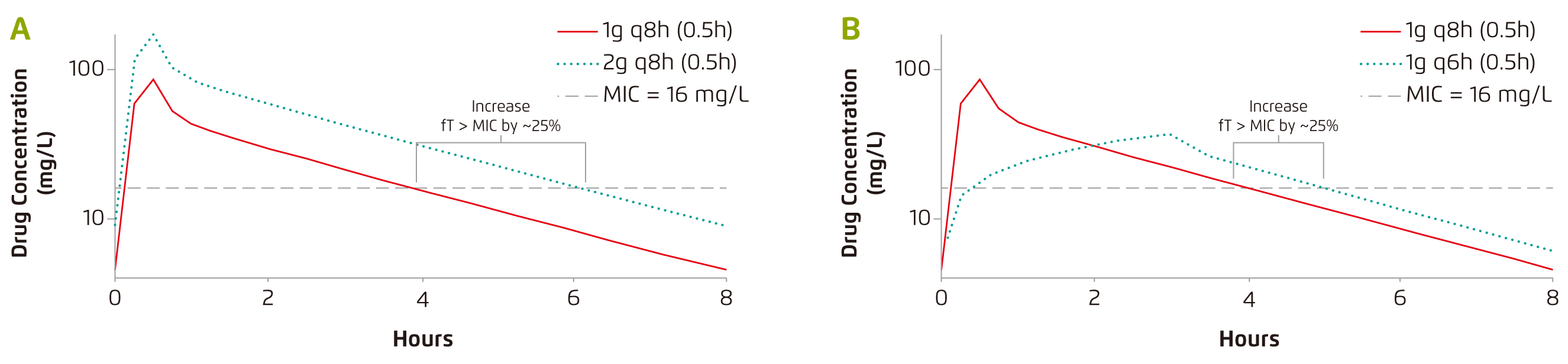 Figure 1. The effect of (a) doubling the antibiotic dose and (b) prolonging infusion duration of £]-lactams13, q8h: every 8 hrs