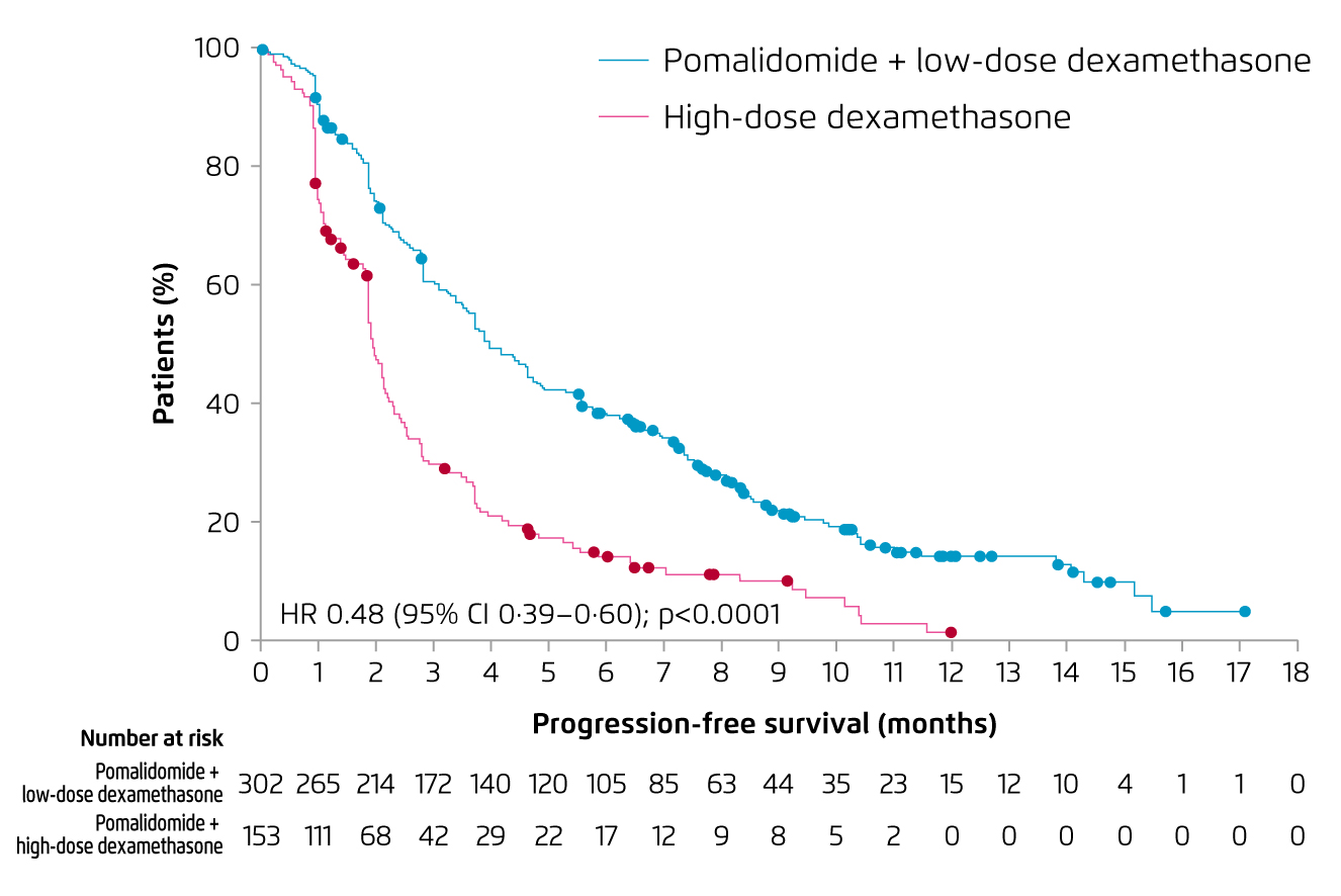 For refractory/relapse myeloma, Prof. Mateos particularly highlighted that pomalidomide is a distinct IMiD with potent antitumour and immunostimulating properties17. In the Phase III MM-003 trial, treatment with pomalidomide plus low-dose dexamethasone (Pom-d, n = 302) achieved significantly longer median PFS as compared to that by high-dose dexamethasone (n = 153) after a median follow-up of 10 months (4.0 months vs. 1.9 months, p < 0.0001, Figure 5)18. Importantly, the overall response rate (ORR) yielded by Pom-d was significantly higher (31% vs. 10%, p < 0.0001). The most common grade 3/4 haematological adverse events in both groups were neutropenia, anaemia, and thrombocytopenia. The occurrence of treatment-related adverse events (AEs) leading to death was comparable between the 2 groups18.