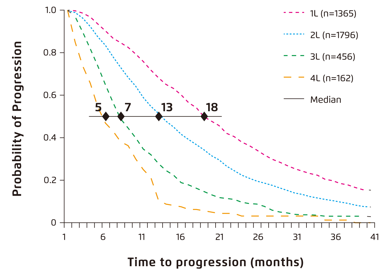 Prof. Sonneveld addressed that myeloma is a very complex disease involving the proliferation of plasma cells derived by different genetic events contributing to the development, progression, and prognosis of the disease. He noted that the complexity of the disease increases during progression, whereas the changes in profile of prognostic factors creates difficulty for physicians to select the right regimen. Unfortunately, the chance for a physician to treat a patient with MM is limited since the duration of time to progression (Figure 1) and the response rate decrease after each line of therapy and the proportion of patients receiving each subsequent line of treatment is decreased as well5. “There may be about 2 to 3 chances for physicians to select regimens for patients, but it is not in all patients,” Prof. Sonneveld expressed. This highlights the importance of sequencing the combinations of therapies available in the right order in treating RRMM.