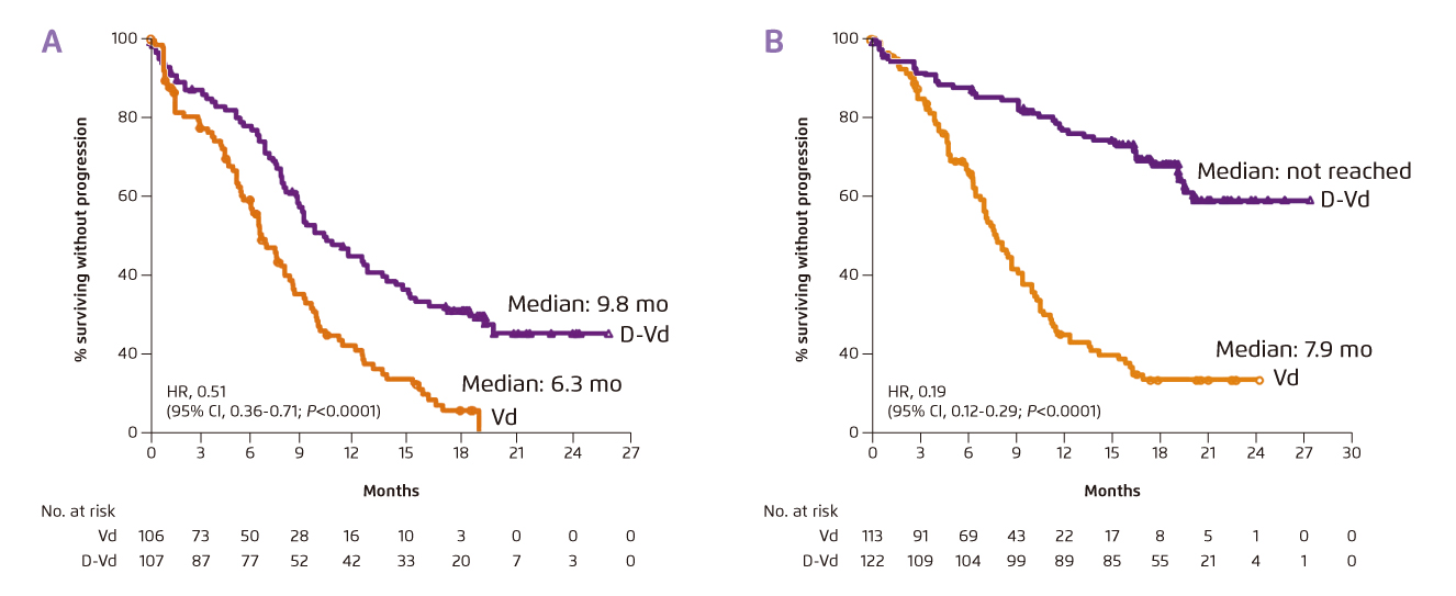 Figure 4. mPFS achieved by DVd and Vd in MM patients with (a) 1 prior line of therapy or (b) 2-3 prior lines of therapy8