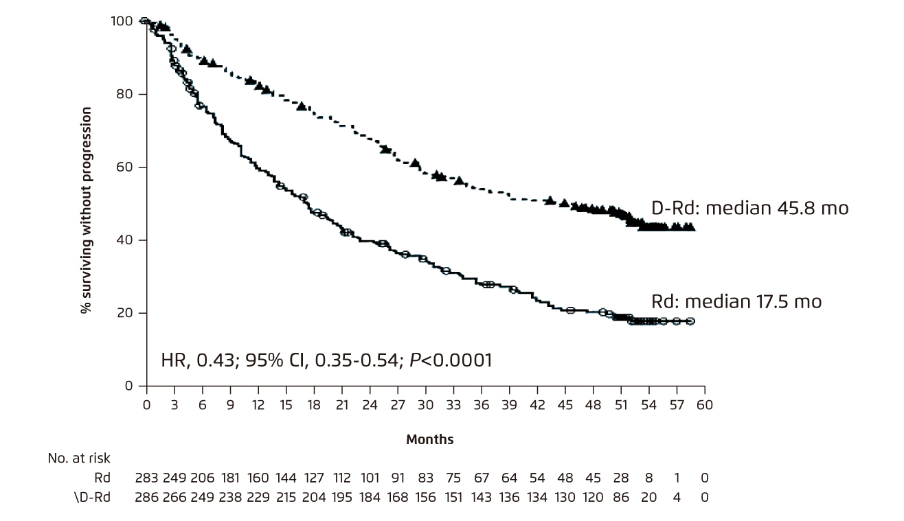 In the 4-year follow-up of the POLLUX trial, triplet therapy with daratumumab-Rd (DRd) was demonstrated to significantly prolonged PFS versus Rd in MM patients with at least 1 prior line of therapy (mPFS: 45.8 months [DRd] vs. 17.5 months [Rd], p <0.0001, Figure 5). Particularly, DRd also significantly prolonged PFS as compared to Rd among patients who received prior lenalidomide (mPFS: 38.8 months [DRd] vs. 18.6 months [Rd], p<0.0001), among patients refractory to bortezomib (mPFS: 34.3 months [DRd] vs. 11.3 months [Rd], p = 0.0004), and regardless of cytogenetic risk status. Furthermore, DRd was associated with a significantly higher ORR versus Rd (93% vs 76%, p <0.0001). Of note, DRd treatment exhibited comparable safety profile with that of Rd, and both treatments were well tolerable9. The findings thus suggested that DRd is a favourable option in MM patients refractory to the first-line therapy.