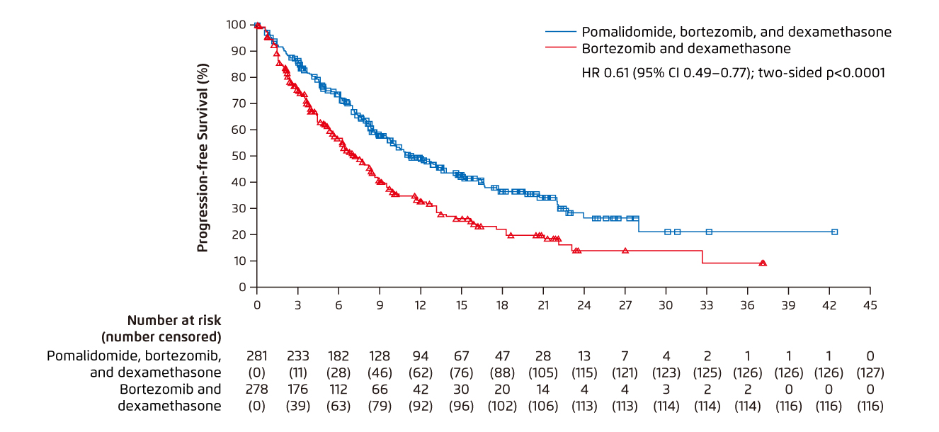 Prof. Sonneveld outlined that there have been clinical trials investigated the efficacy of Pd-based therapies in RRMM. For instance, in the OPTIMISMM trial, patients with previous lenalidomide treatment were randomly assigned to receive pomalidomide-Vd (PVd) or Vd. After the median follow-up of 15.9 months, PVd significantly improved PFS as compared to Vd (11.2 months [PVd] vs. 7.1 months [Vd], p < 0.0001, Figure 6). The ORR for the PVd treatment was 82.2%, which was significantly higher than that of Vd (50.0%, p <0.001)10. Of importance, in the subgroup of patients with lenalidomide refractory disease and 1 prior line treatment, PVd yielded significant improvement in mPFS (17.8 months) versus Vd (9.5 months, p = 0.003)10, indicating the effectiveness of PVd in prolonging PFS in MM patients with lenalidomide refractory disease and/or with 1 prior line treatment.