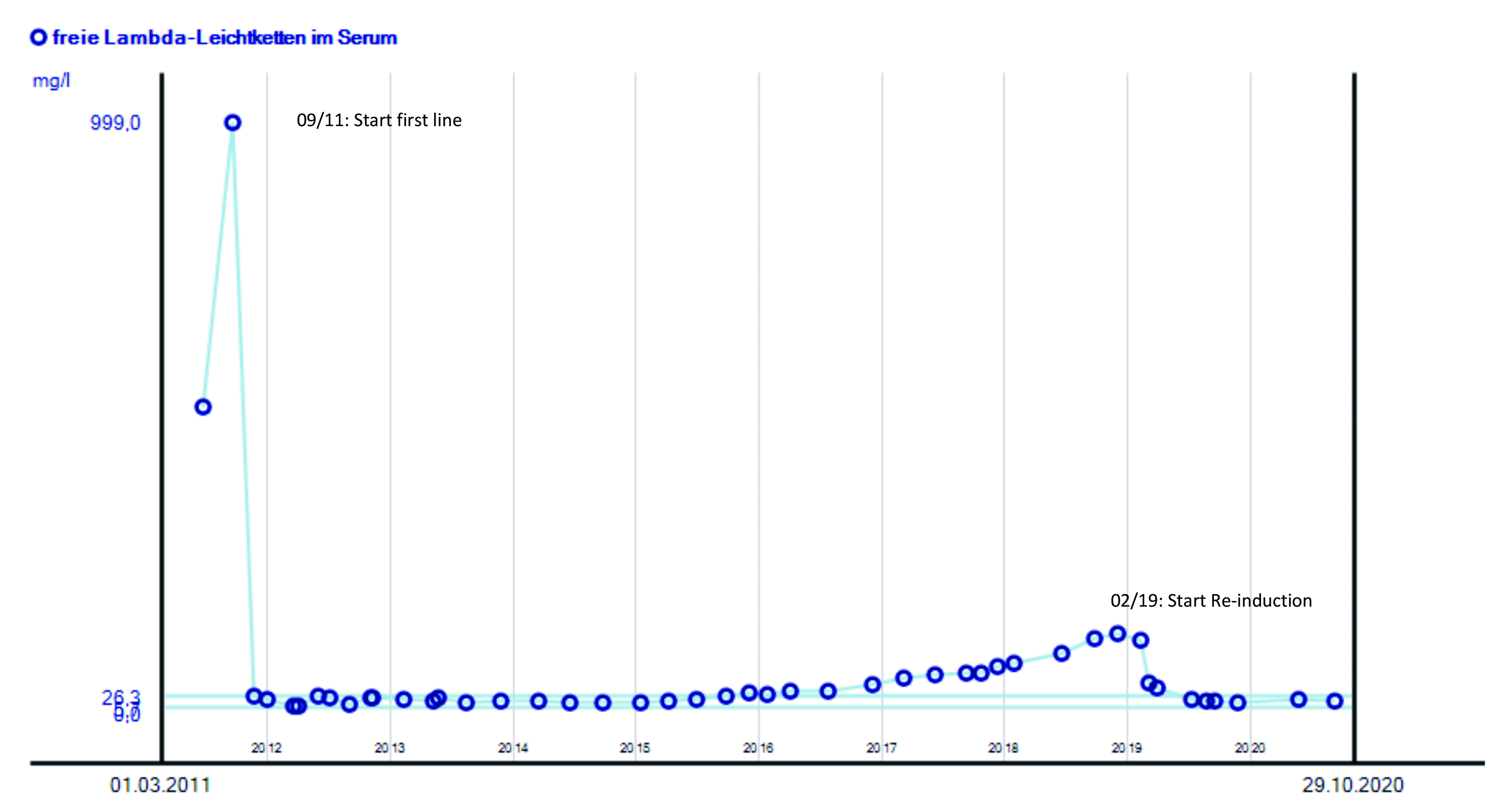 To counter the relapse disease, Prof. Goldschmidt performed re-induction therapy with 3 cycles of Pd, and then 2 cycles of Pd with cyclophosphamide during February to April 2019. In May 2019, high-dose melphalan was prescribed, followed by ASCT. Partial response to the treatment was achieved. In August 2019 and March 2020, the patient was on maintenance therapy with Rd, whereas monotherapy of lenalidomide was used for maintenance since March 2020 and the patient is now in remission. The change in free lambda light chains in serum of the patient during the treatment course is shown in Figure 3.