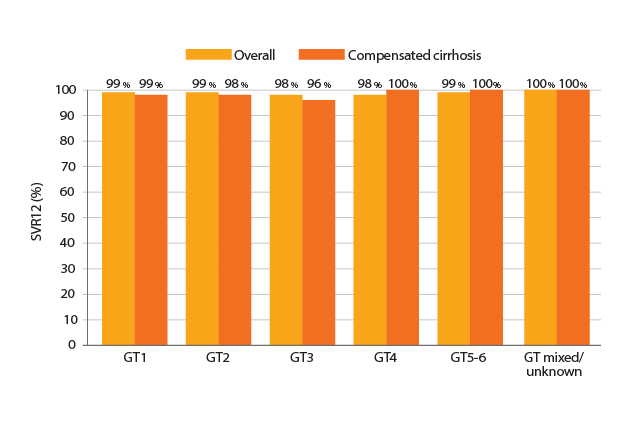 Recent global real-world evidence, which involved 5,541 patients from 12 clinical practice cohorts within 7 American and European countries, further support the efficacies of sof/vel in viral suppression. The results confirmed that an overall SVR for 12 weeks (SVR12) achieved by sof/vel was ≥98% across all genotypes. Essentially, sof/vel was proven to be effective irrespective of compensated cirrhosis (Figure 2). Dr. Liu addressed based on subgroup analysis of the real-world evidence that sof/vel yielded SVR12 ≥96% in various sub-populations including current or former intravenous drug users, age >70 and co-infected with HIV7.