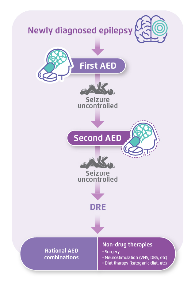 Figure 1. An algorithmic approach for the treatment of epilepsy1, 2. AED=antiepileptic drug. DBS=deep brain stimulation. DRE=drug-resistant epilepsy. VNS=vagus nerve stimulation.