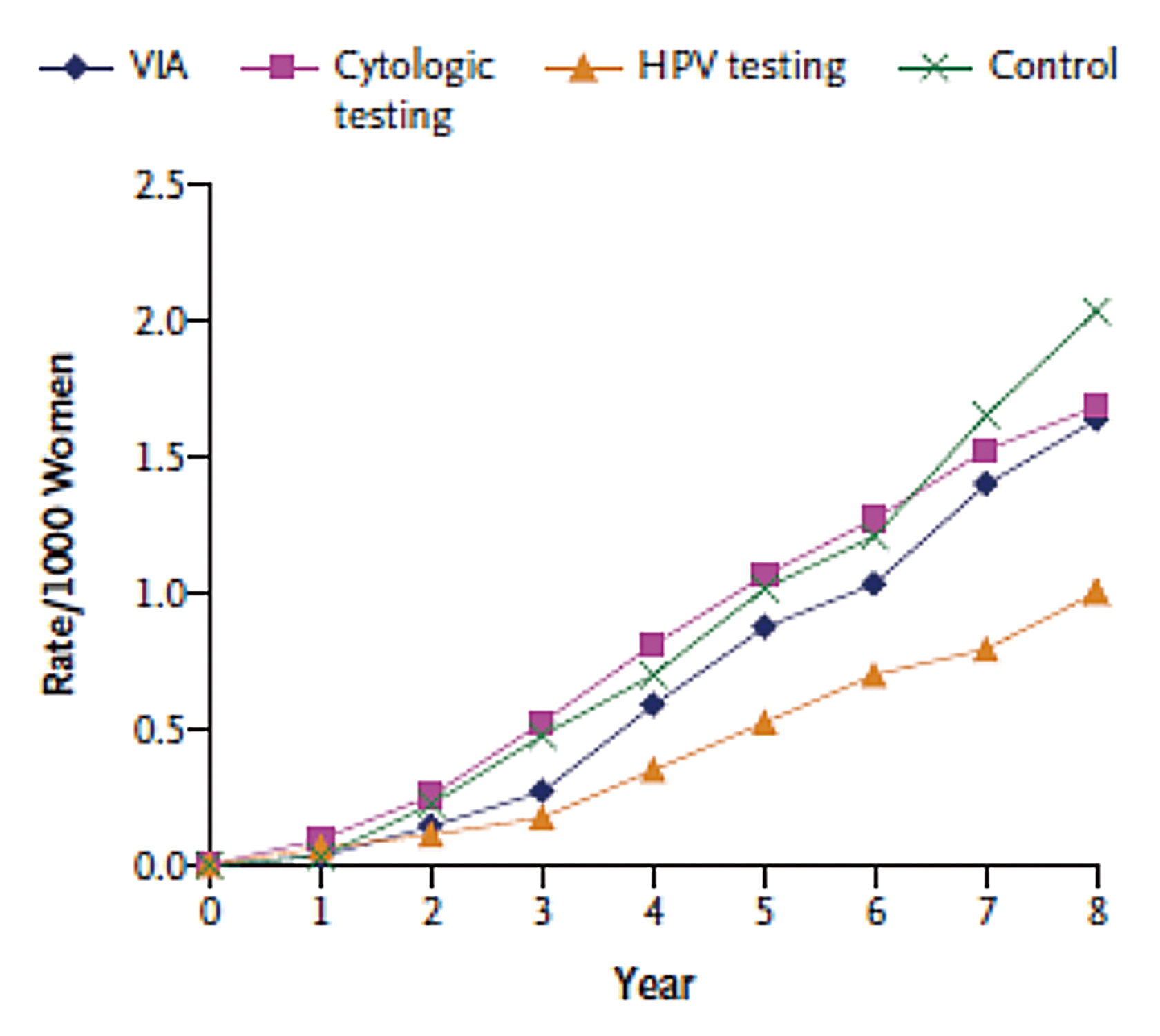 Figure 2. Cumulative mortality of cervical cancer in screened clusters and control5, VIA: visual inspection of the cervix with acetic acid