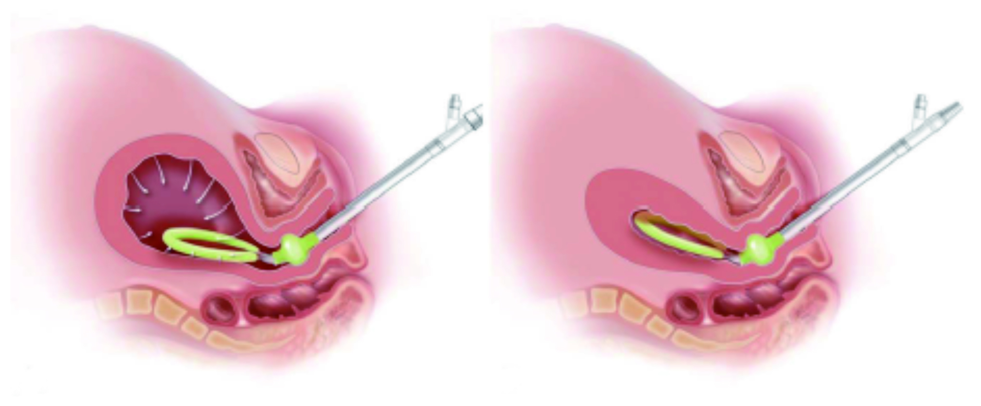 Figure 1. Placement of intrauterine VIHC device with (A) vacuum source connected and (B) uterine contraction (Images courtesy of D’Alton et al (2020))9