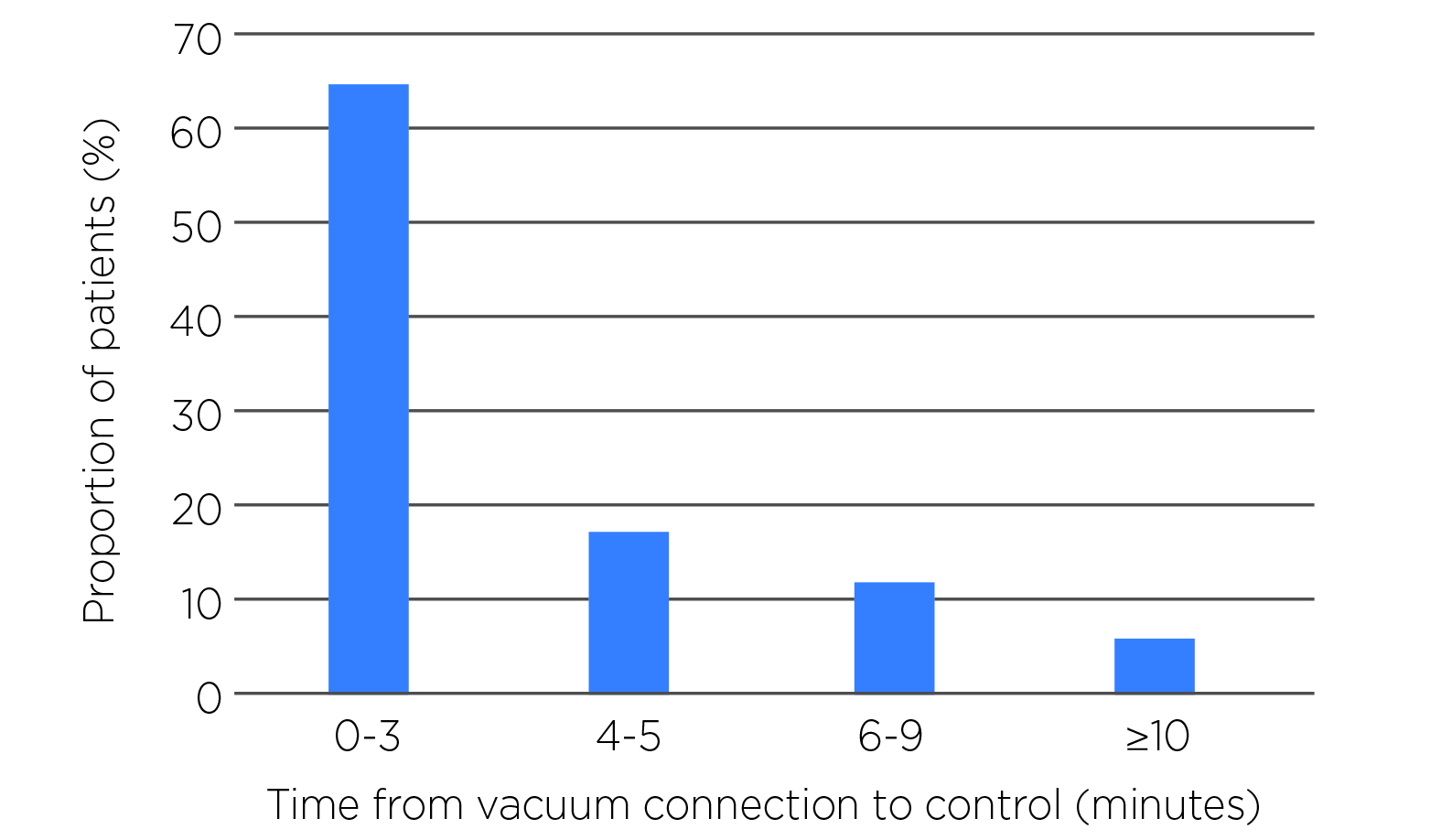 Importantly, among the successful cases with VIHC device, the initial collapse of the uterus was reported to occur in a median of 1 minute from the time of vacuum connection. Moreover, 82% of the subjects, whose abnormal bleeding was controlled by the VIHC device, had the control occur within 5 minutes, with a median time of 3 minutes (Figure 2). Besides, eight device- or procedure-related adverse events were reported in the study, and all were resolved with treatment without serious clinical sequelae9.