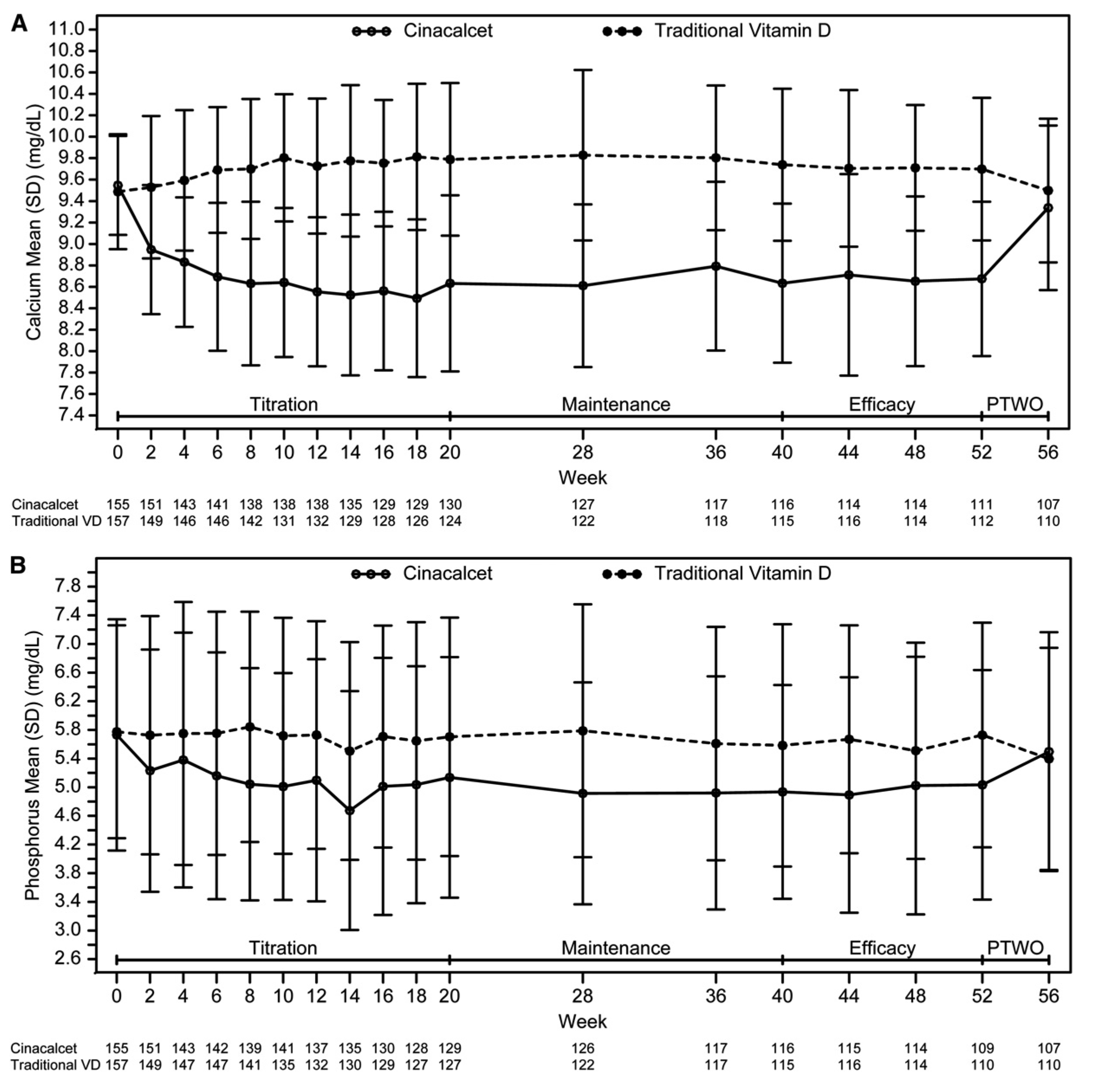 Figure 1. Mean (SD) total corrected calcium and serum phosphorus over time by treatment arm. Mean (SD) total corrected serum calcium (A) and serum phosphorus over time by treatment arm (B). PTWO, posttreatment washout phase. (Adapted from Wetmore et al. Clin J Am Soc Nephrol 2015)