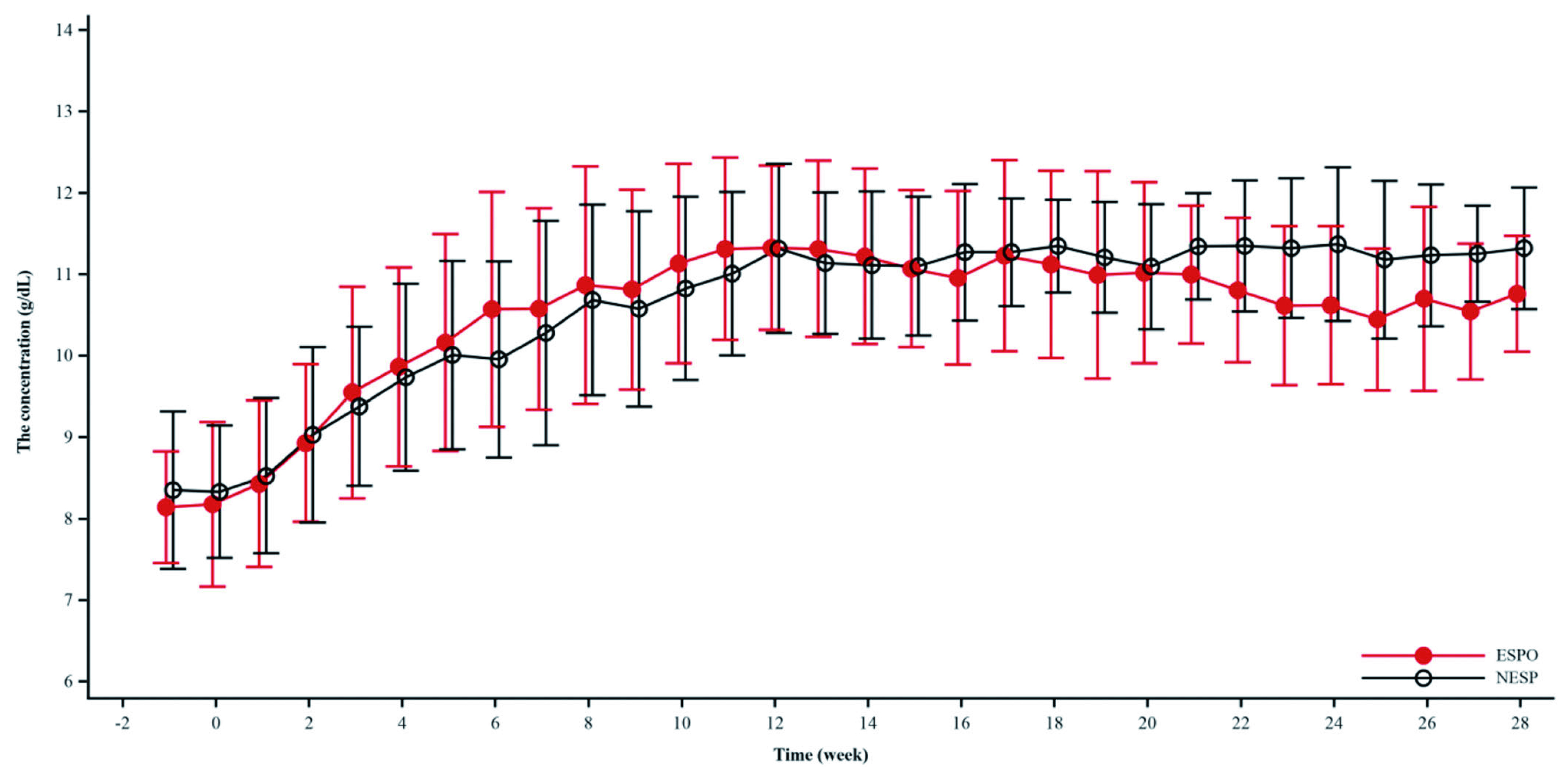 Figure 2. Changes in the mean haemoglobin level from baseline achieved by darbepoetin and epoetin (Adapted from Chen et al. Chronic Dis Transl Med 2022)