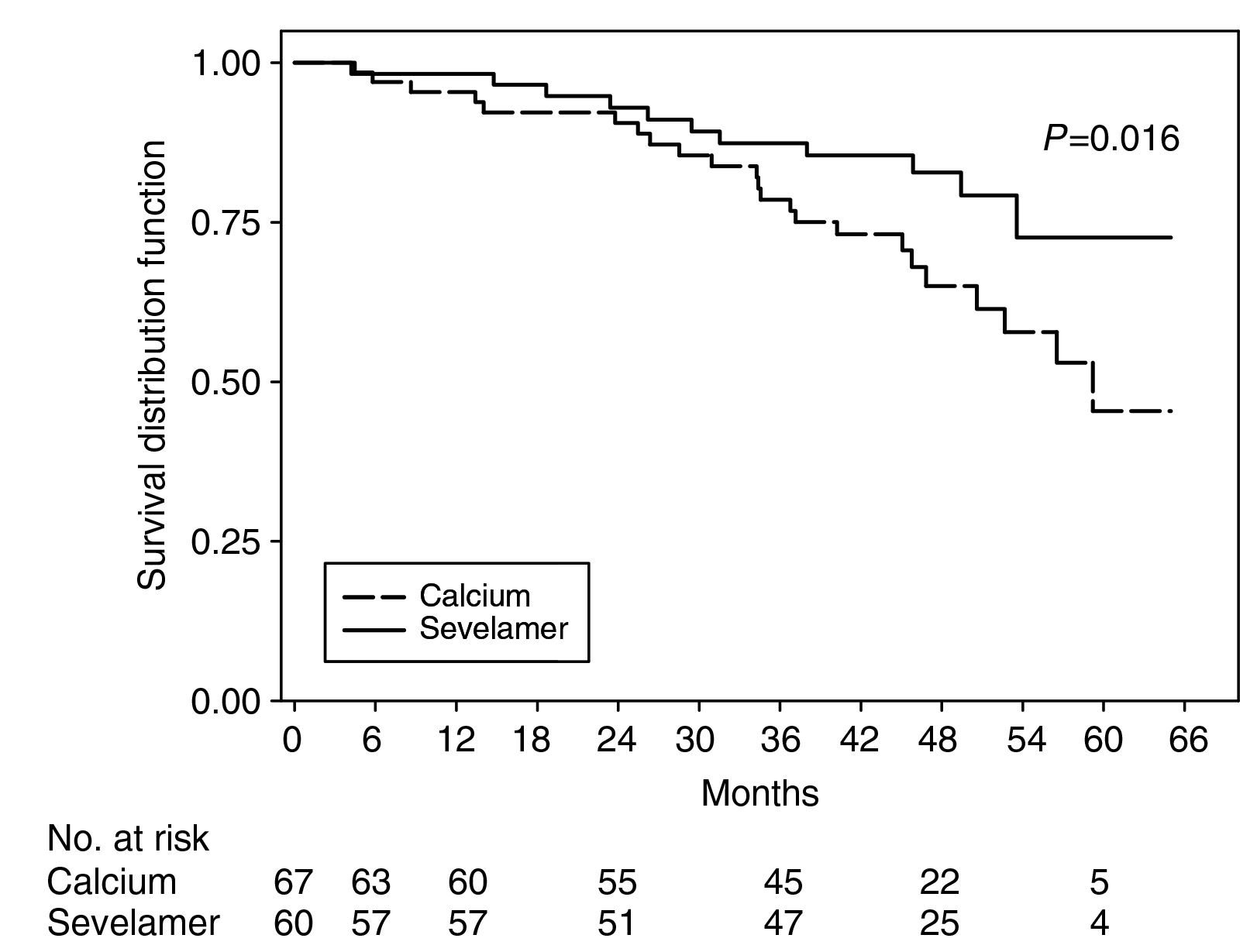 Sevelamer is a non-calcium-based phosphate binder. In the RIND study, patients newly on HD treated with sevelamer were demonstrated to have better survival than those treated with a calcium-based phosphate binder (Figure 3)21. Moreover, sevelamer was also associated with decreased CACs in new HD patients22. In the TTG study, sevelamer reduced VCs in the coronary artery and aorta of HD patients compared to those treated with calcium acetate23.