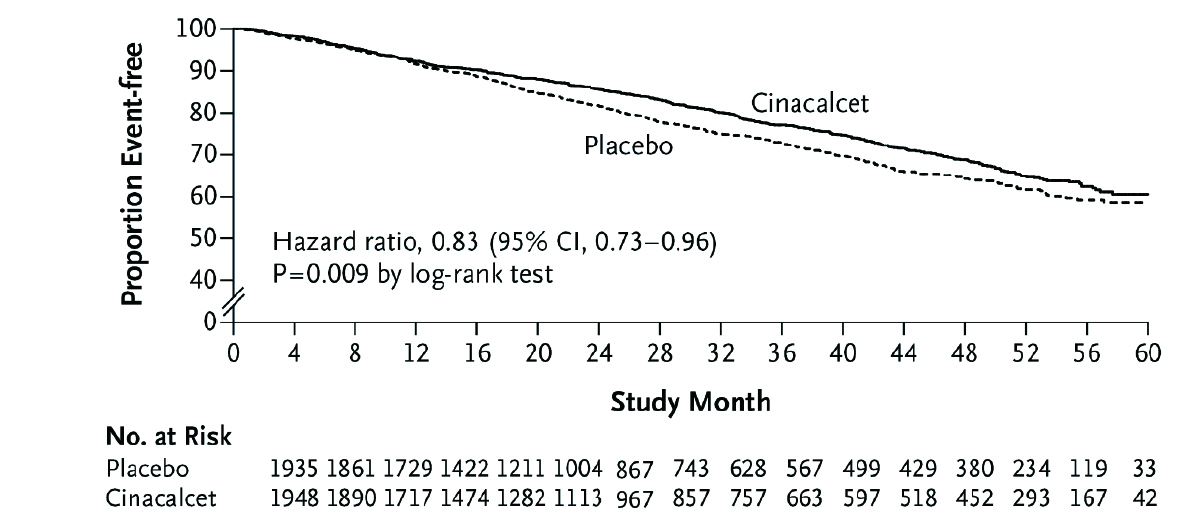 Figure 4. Kaplan-Meier curve comparing cinacalcet with placebo for the time to death (Adapted from Chertow et al. N Engl J Med 2012)