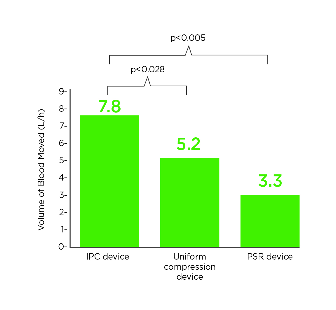 The hemodynamic impact of IPC device, uniform compression device, and posterior sequential rapid gradient inflation (PSR) device had been compared in a previous clinical trial by Griffin et al (2007) involving 12 patients with primary bilateral varicose veins. The results indicated that all three devices increased flow during compression by 2.5-3 times compared to the median baseline flow (p<0.0001). Remarkably, the total volume expelled per hour during compression by IPC device was 7,800ml, which was significantly higher than both uniform compression device (5,200ml, p<0.028) and PSR device (3,300ml, p<0.005, Figure 1)5. The high volume of blood moved by IPC device was due to the increased volume per cycle and more compression cycles over time. The findings thus confirmed the hemodynamic effectiveness of IPC device.