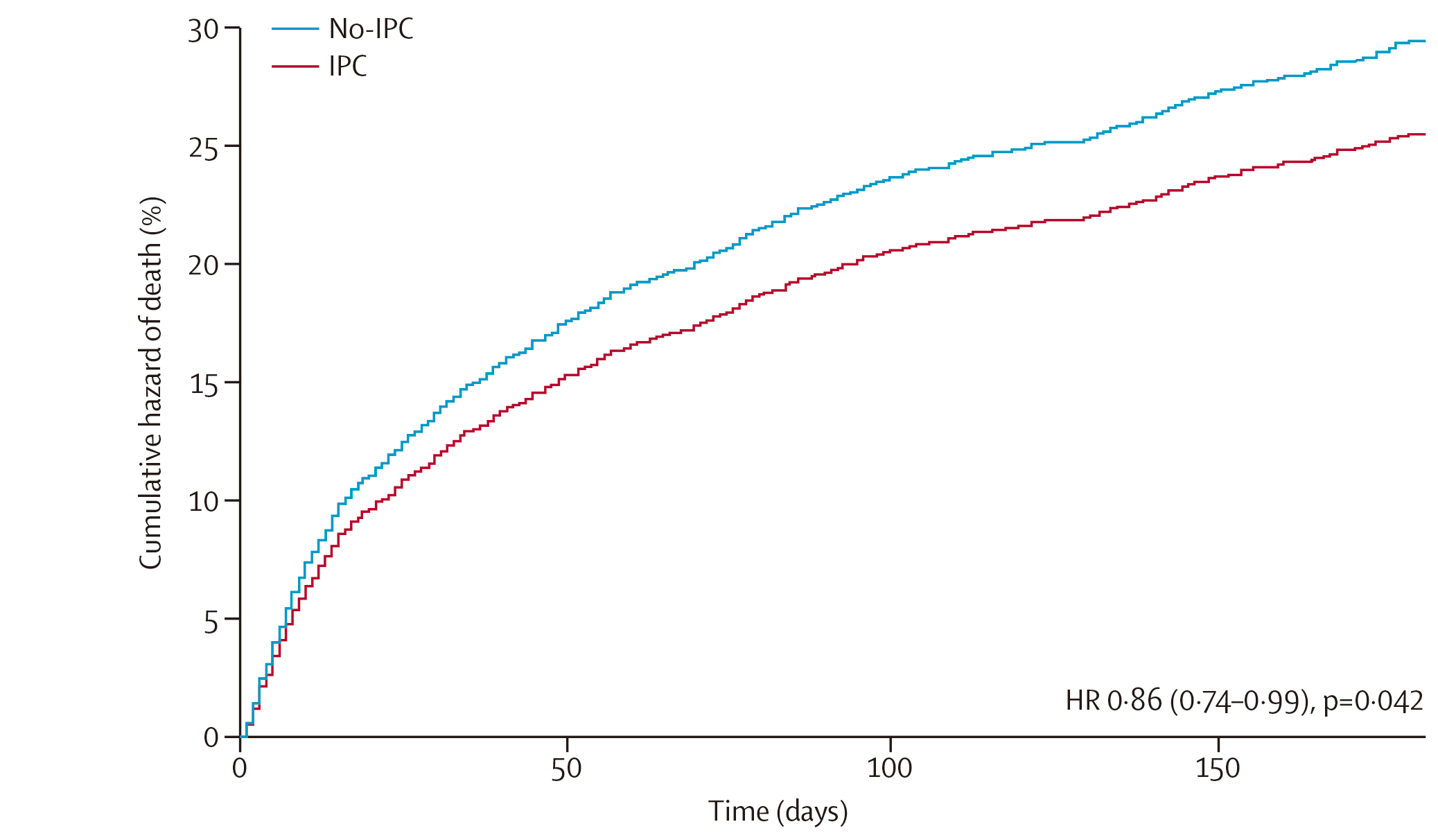 Figure 2. Cumulative hazard of death during the 6 months after randomisation in IPC and control groups7