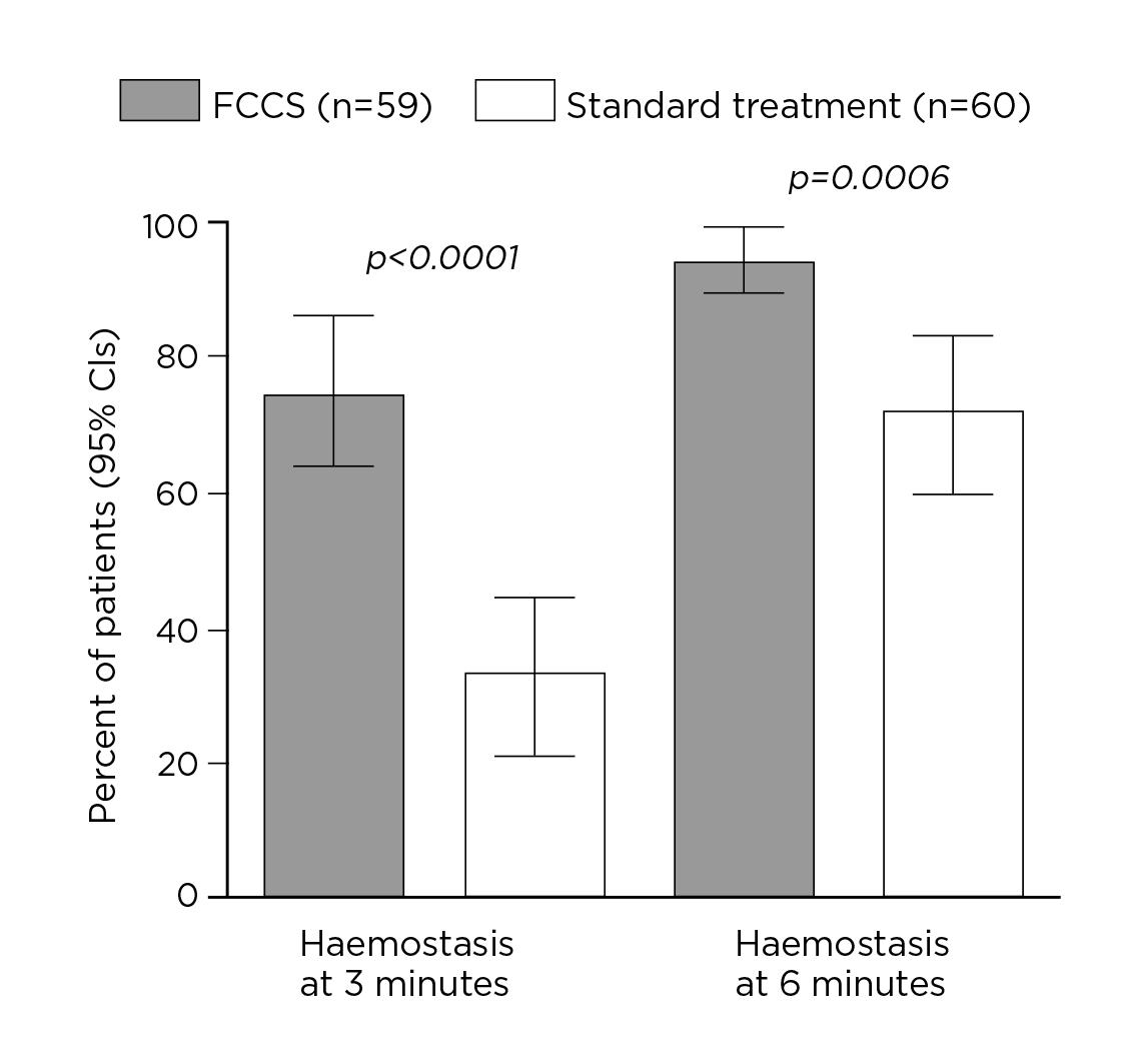 The clinical performance of FCCS in various operative fields has been evaluated in previous studies. For instance, Maisano et al (2009) compared the efficacy and safety of FCCS and standard haemostatic fleece to control bleeding in patients undergoing cardiovascular surgery. Among the 119 patients scheduled for elective surgery on the heart, ascending aorta or aortic arch requiring cardiopulmonary bypass, 59 were allocated to receive FCCS and the remaining received standard treatment after primary haemostatic measures. The results demonstrated superior efficacy in controlling bleeding in FCCS-treated patients after insufficient primary haemostasis compared to standard treatment. Remarkably, 75% of FCCS-treated patients achieved haemostasis at 3 minutes, whereas that achieved by standard treatment was only 33% (p <0.0001). Moreover, 95% of patients in the FCCS group achieved haemostasis at 6 minutes, significantly higher than standard treatment (72%, p=0.0006, Figure 1). The results indicated no significant differences in the occurrence of adverse events between the trial treatments5.