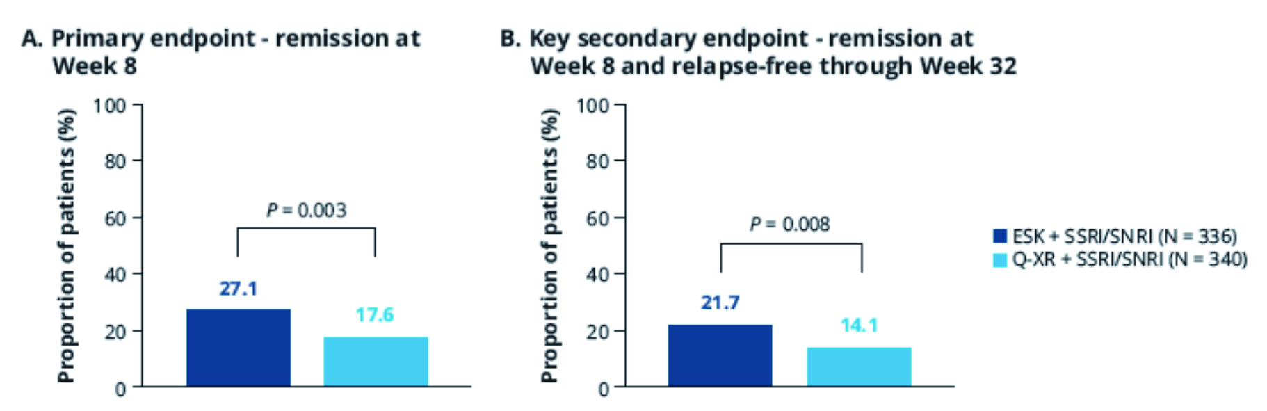 After 32 weeks, the primary and key secondary endpoints were met, suggesting superiority of esketamine augmentation to quetiapine XR augmentation in achieving TRD remission.17 For primary endpoint at Week 8, there were significantly more patients achieving remission in the esketamine group compared to the quetiapine XR group (27.1% vs 17.6%; Figure 1A).17 Patients treated with esketamine augmentation were 74% more likely to achieve remission than those with quetiapine XR (Adjusted OR 1.74, p=0.003).17 Furthermore, the advantage of esketamine sustained throughout the treatment period.17 80% of esketamine-treated patients in remission at Week 8 remained relapse-free through to Week 32.17 The proportions of patients achieved remission at Week 8 without subsequent relapse were 21.7% and 14.1% for esketamine and quetiapine respectively (Figure 1B).17 Patients treated with esketamine augmentation were 72% more likely to achieve remission and remain relapse-free than those with quetiapine XR (Adjusted OR 1.72, p=0.008).17 Beyond Week 8, an increasing trend in the percentage of remitters was observed in both treatment arms and the results of esketamine arm were numerically higher than that of quetiapine XR.17 At the end of trial, more than 50% of esketamine-treated patients achieved remission, compared to 37% of those quetiapine-XR-treated (Figure 2).17