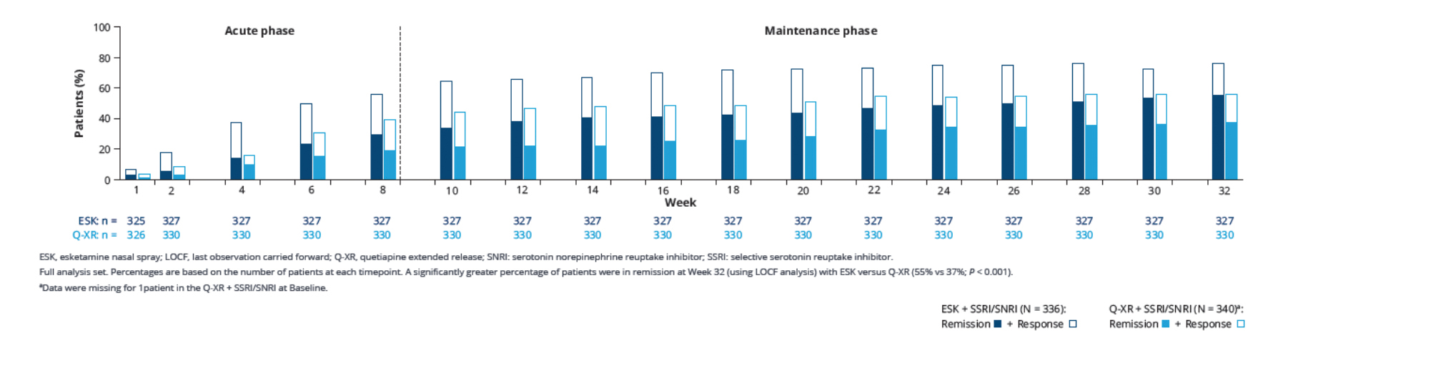 The ESCAPE-TRD trial consisted of a 8-week acute phase followed by a 24-week maintenance phase.10 Patients were 1:1 randomized to receive either esketamine or quetiapine XR in combination with an ongoing SSRI/SNRI in accordance with their respective labels.10 Esketamine NS was flexibly dosed twice weekly from Weeks 1-4, then weekly from Weeks 5-8 and eventually weekly or every two weeks from Weeks 9-32; quetiapine XR was flexibly dosed and administered daily.10 All patients included had experienced non-response* with ≥2 consecutive treatments from different AD classes at an adequate dosage for ≥6 weeks during current depressive episode.10 The primary endpoint was remission at Week 8, adopting the criteria of Montgomery‑Åsberg Depression Rating Scale (MADRS) total score of ≤10.10,17 Key secondary endpoint was remission at Week 8 without subsequent relapse through Week.10,17 Other secondary endpoints incorporated patient-reported outcomes^, clinician-rated scales and questionnaires#, and adverse events.10 For both primary and key secondary endpoints, treatment discontinuation was considered as a negative outcome.10 The baseline characteristics and psychiatric history were similar across treatment arms.17