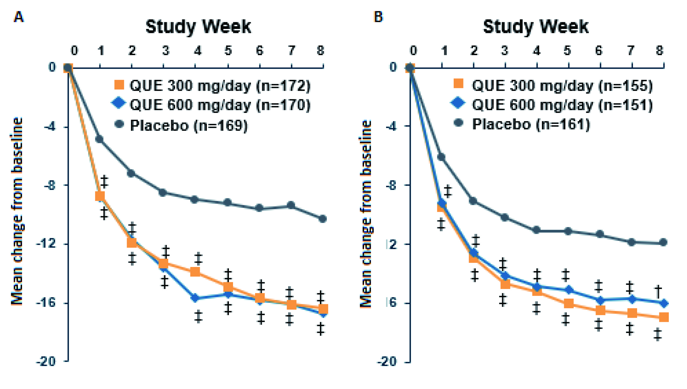 Figure 3. Changes from baseline in MADRS total score achieved by quetiapine in A) BOLDER I and B) BOLDER II trials 11,12, QUE: quetiapine, ‡p<0.001, †p<0.01