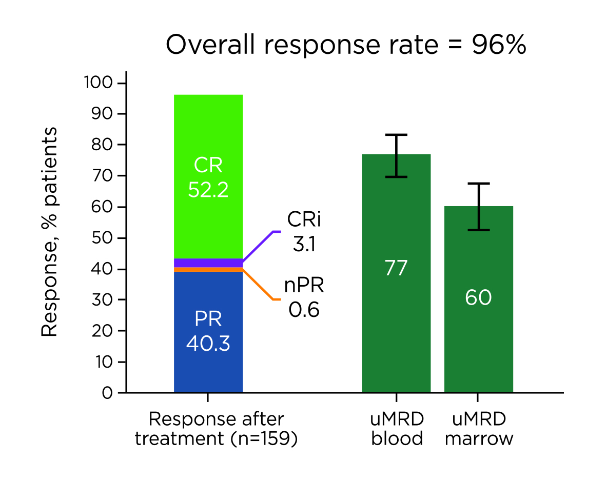 Figure 1. Best overall responses in all-treated patients7, CRi: CR with incomplete BM recovery, PR: partial response, nPR: nodular partial response. uMRD: undetectable minimal residual disease