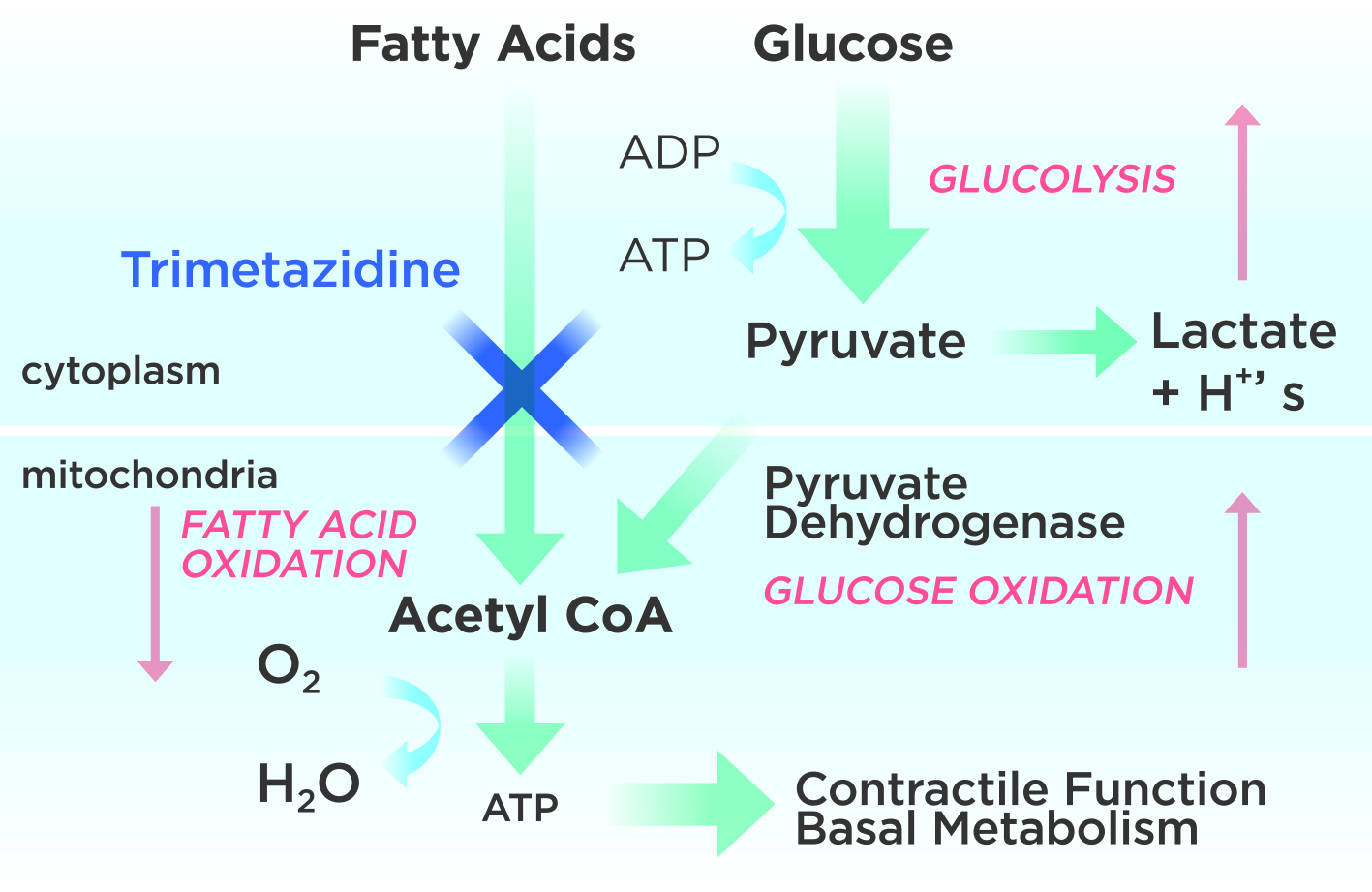 Figure 2. Mechanism of action of Trimetazidine begins with inhibiting fatty acid oxidation, adapted from Lopatin YM 201618.