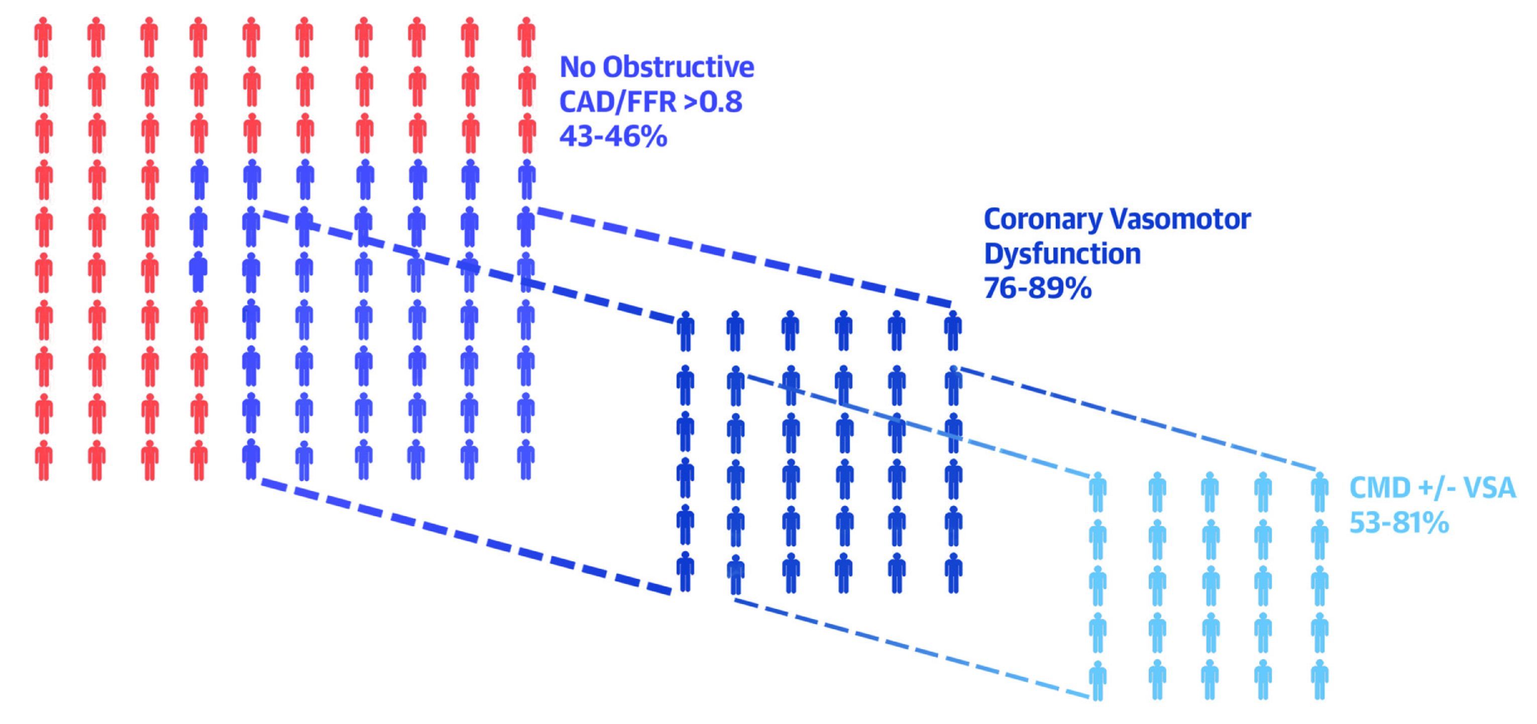 The various physical mechanisms of ischaemic heart disease boil down to Coronary Microvascular Dysfunction (CMD), which functionally manifests as microvascular spasms, abnormal vasodilation, and endothelial dysfunction with or without vascular smooth muscle cell dysfunction11. Practically, smaller vessels in the microcirculation system, such as periarteriolar, arteriolar, and capillaries, do not show up in an angiogram, making diagnosis difficult and revascularisation procedures impossible. In up to 50% of patients with non-obstructive CAD (Figure 1), CMD may remain undiagnosed and maybe the reason for unexplained persistent angina symptoms12.