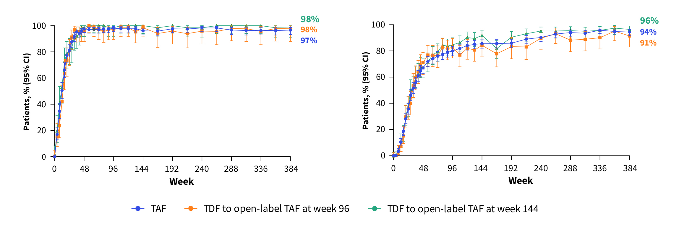 In light of the adverse renal and bone impacts of TDF, investigations on switching from TDF to TAF have been conducted for the sake of optimal treatment outcomes. In the phase III 108/110 studies, the long-term outcomes of TAF or switching from TDF to TAF were evaluated. 866 CHB patients were randomly allocated to receive TAF, and 432 patients received TDF with rollover to open-label TAF at week 96 (n=207) or week 144 (n=225). After 8-year follow-up, ≥94% of patients on TAF and ≥91% of patients switched from TDF to TAF maintained HBV suppression, regardless of HBeAg status (Figure 2A and 2B).