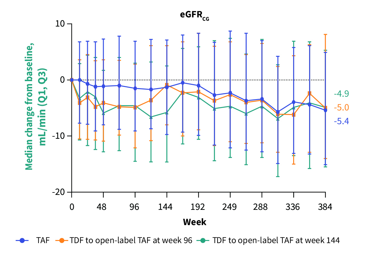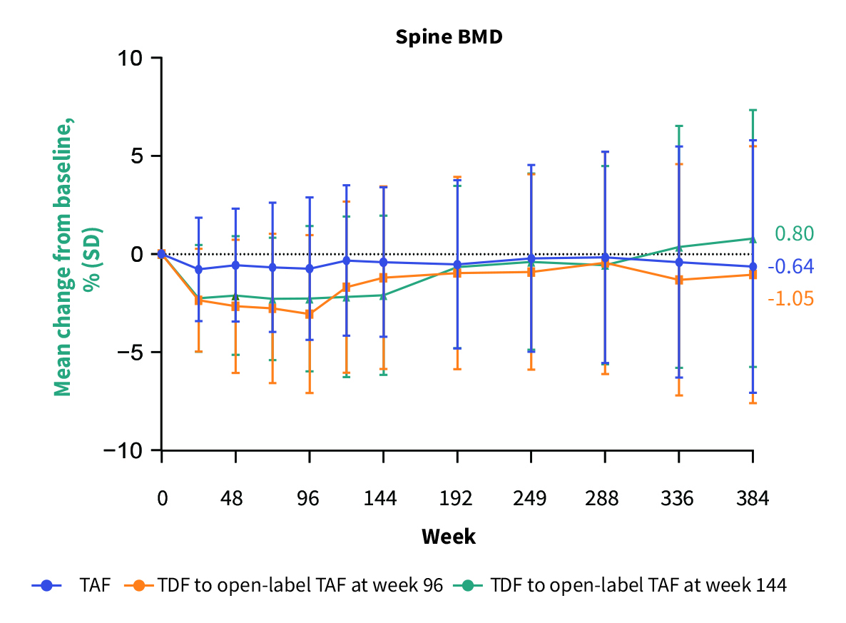 Remarkably, no resistance to TAF was observed through 8 years of treatment12. Notably, the 8-year follow-up results demonstrated that switching from TDF to TAF reversed the TDF-induced renal impairment (Figure 3) and bone loss (Figure 4)13.