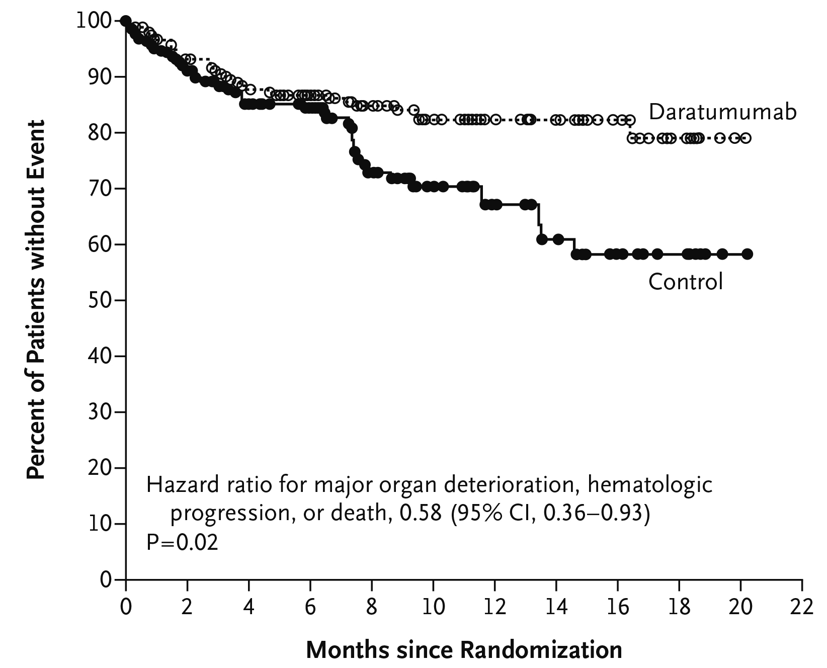 Furthermore, patients treated with daratumumab achieved rapid haematological response that deepened over time with no unexpected side-effects from neither daratumumab itself nor from any of the combination partners that are used23. The findings reported by Dr. Wong were also substantiated in the ANDROMEDA trial, which included 388 patients newly diagnosed with AL amyloidosis21. They were randomised to receive six cycles of bortezomib, cyclophosphamide, and dexamethasone either alone (control group) or with subcutaneous daratumumab, followed by a single agent daratumumab every 4 weeks for up to 24 cycles (daratumumab group) with a median follow-up period of 11.4 months21. Haematologic complete response was the primary endpoint and the percentage of patients achieving the primary endpoint was significantly higher in the daratumumab group compared to the control group (53.3% vs 18.1%) (relative risk ratio of 2.9; 95%, confidence interval [Cl]: 2.1-4.1; p<0.001)21. Moreover, the survival free from major organ deterioration or haematologic progression favoured the daratumumab group (hazard ratio of 0.58; 95%, CI: 0.36-0.93; p= 0.02) (Figure 1)21.