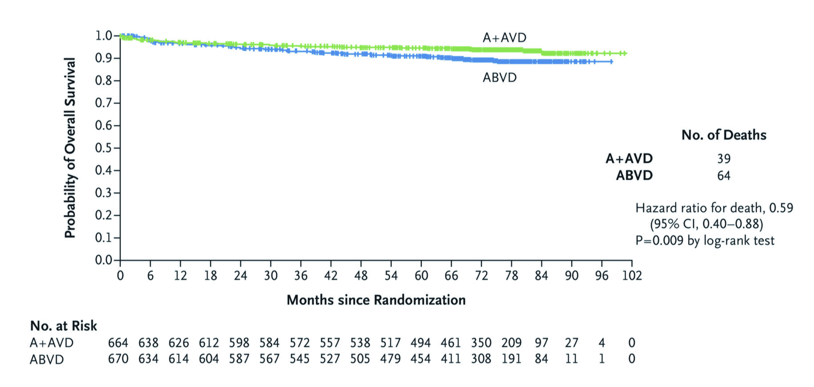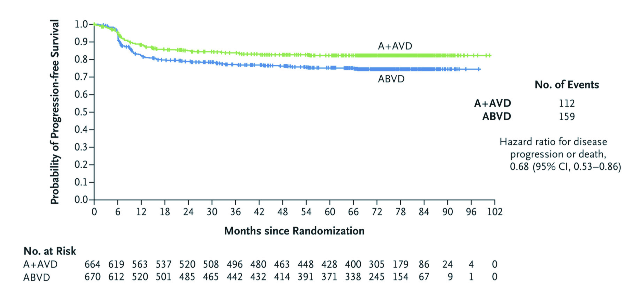 Remarkably, the 6-year modified PFS estimates assessed by investigators were 82.3% in the BV+AVD group, which was higher than the ABVD group at 74.5% (hazard ratio for disease progression or death, 0.68; 95% CI, 0.53 to 0.86) (Figure 2)28.