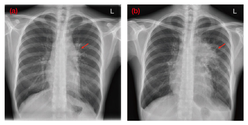 Figure 3. An erect chest x-ray of the patient (a) taken during onset of symptoms at first medical consultation in early February 2022 and (b) taken prior to the commencement of chemotherapy in April 2022. Red arrows indicate (i) early signs of left hilar changes, (ii) prominent left hilar and mediastinal masses (Image provided by Dr. Sin)