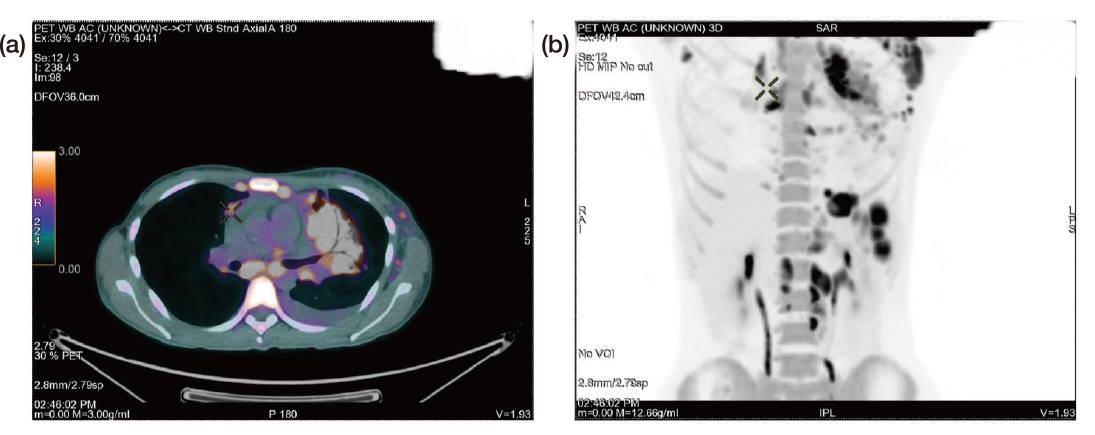 Figure 4. PET-CT images of the patient after diagnosis of stage IV Hodgkin¡¦s lymphoma (a) axial view and (b) anterior view (Image provided by Dr. Sin)