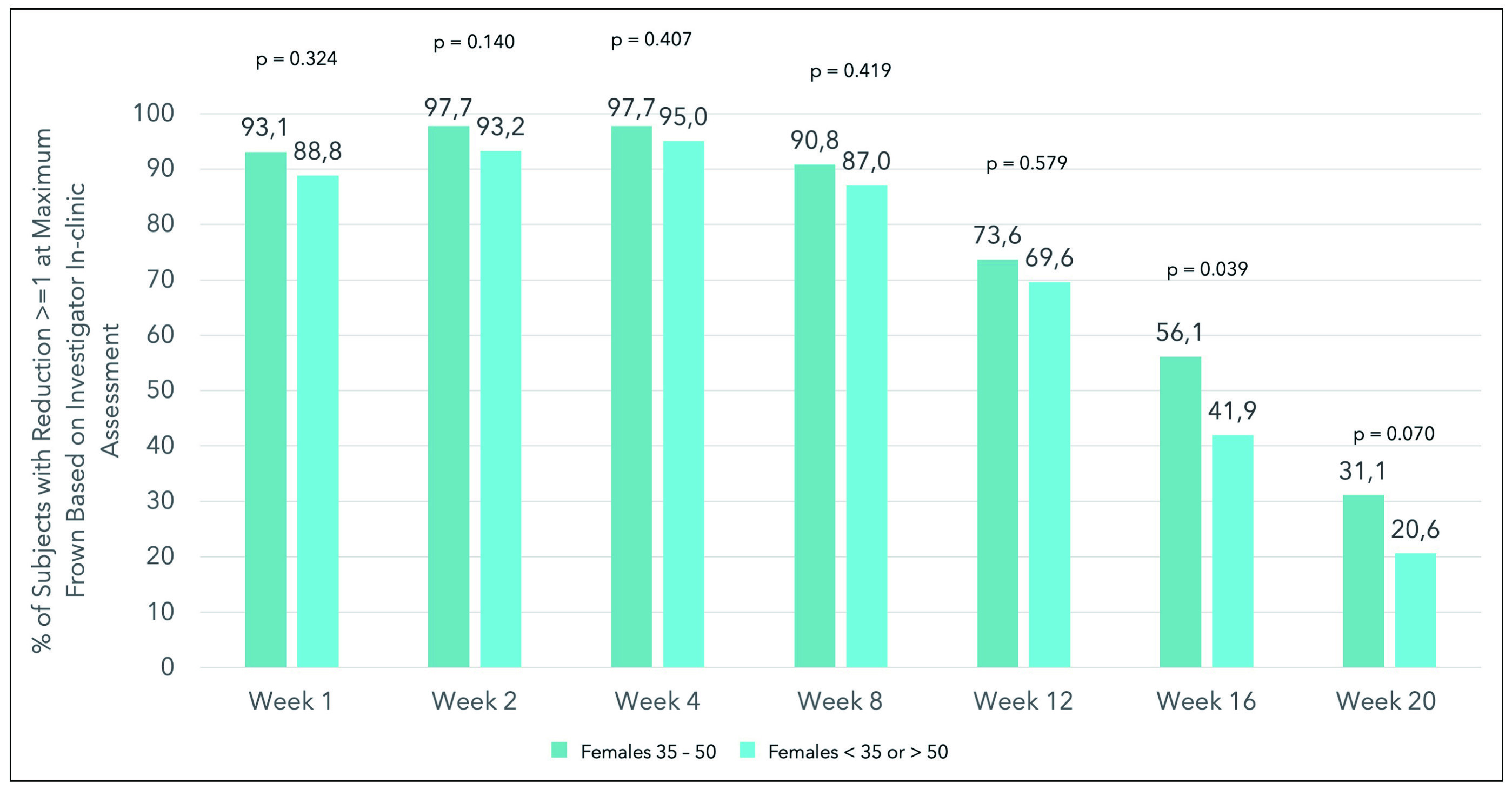 Figure 2. The percentage of patients with reduction ≥1 at maximum frown based on investigator in-clinic assessment for females aged 35 to 50 years and younger than 35 or older than 50 years1.