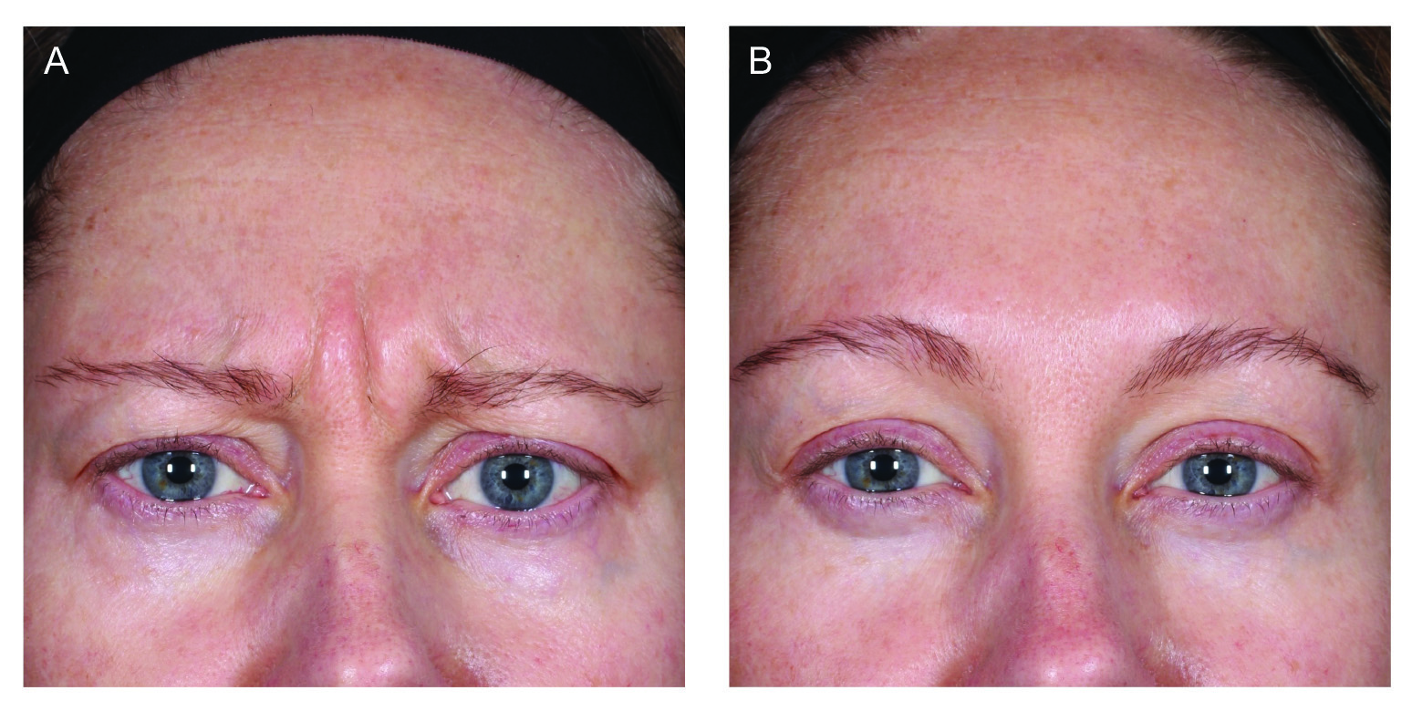 Figure 1. Before and after images of a female subjects at (A) baseline and (B) after 4 weeks11.