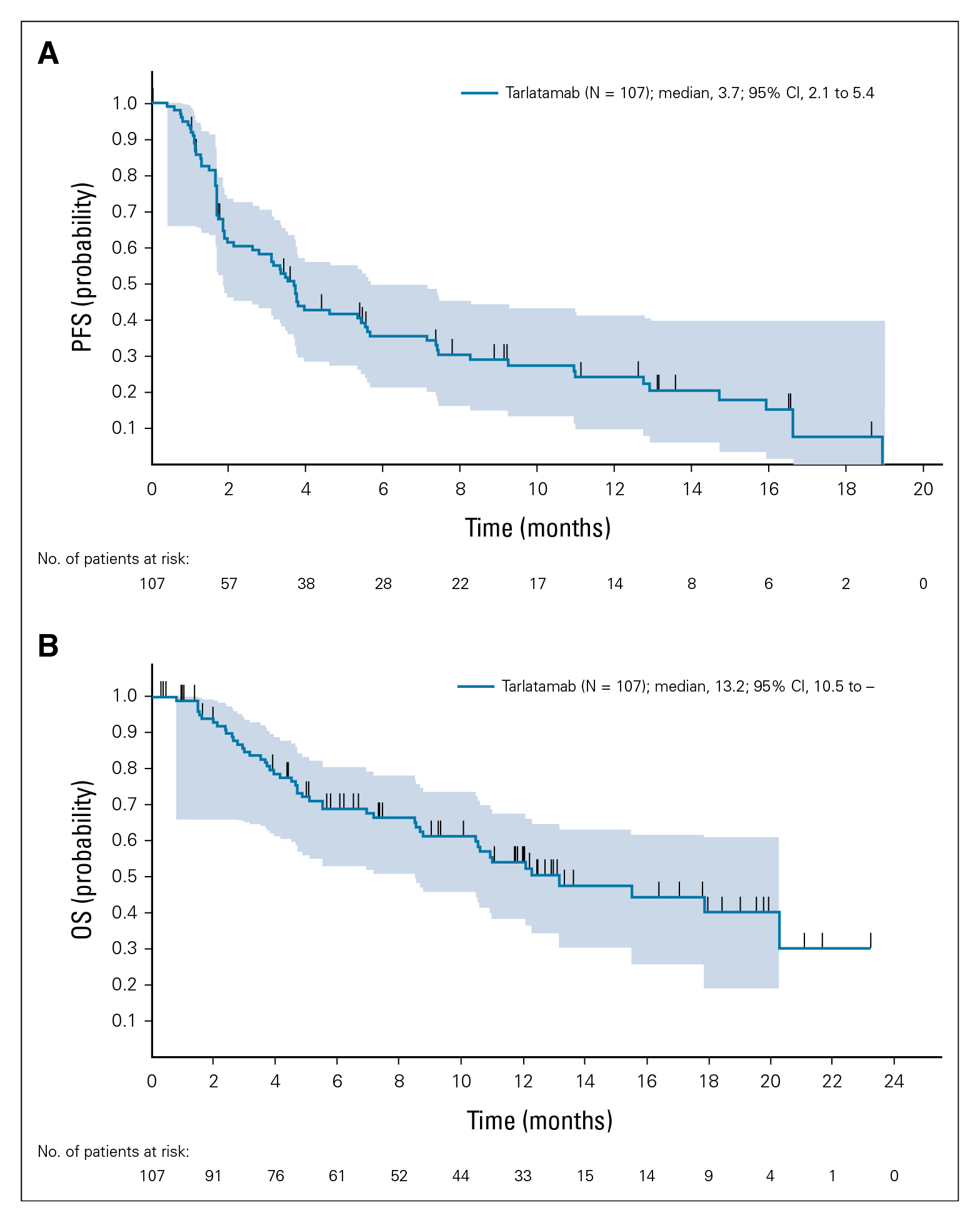 Figure 1. efficacy of tarlatamab in patients with SCC. (A) Kaplan-Meier curve of PFS for patients whose data cutoff date is at least 9 weeks after the first dose date (n=107). (B) Kaplan-Meier curve of OS for patients whose data cutoff data is at least 9 weeks after the first dose date (n=107)1. OS= overall survival; PFS= progression-free survival; SCLC= small-cell lung cancer.